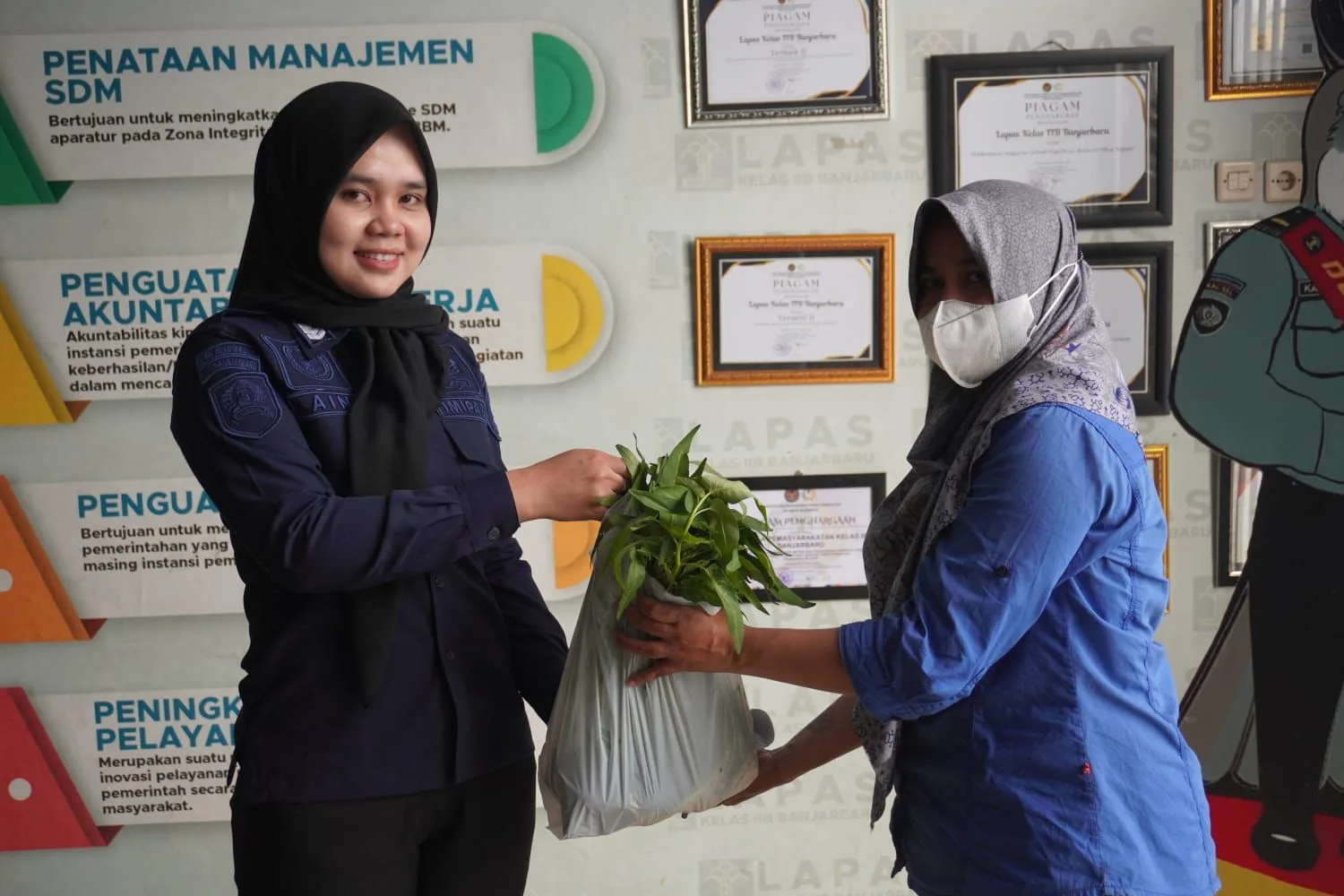 Sebanyak 20 bingkisan berisi sayur kangkung dan ubi dibagikan oleh Kepala Subbagian Tata Usaha (Kasubag TU) beserta jajaran petugas kepada keluarga Warga Binaan yang sedang melakukan kunjungan di Lapas Banjarbaru. Pembagian ini merupakan bagian dari pemanfaatan hasil panen kebun binaan yang dikelola secara rutin.