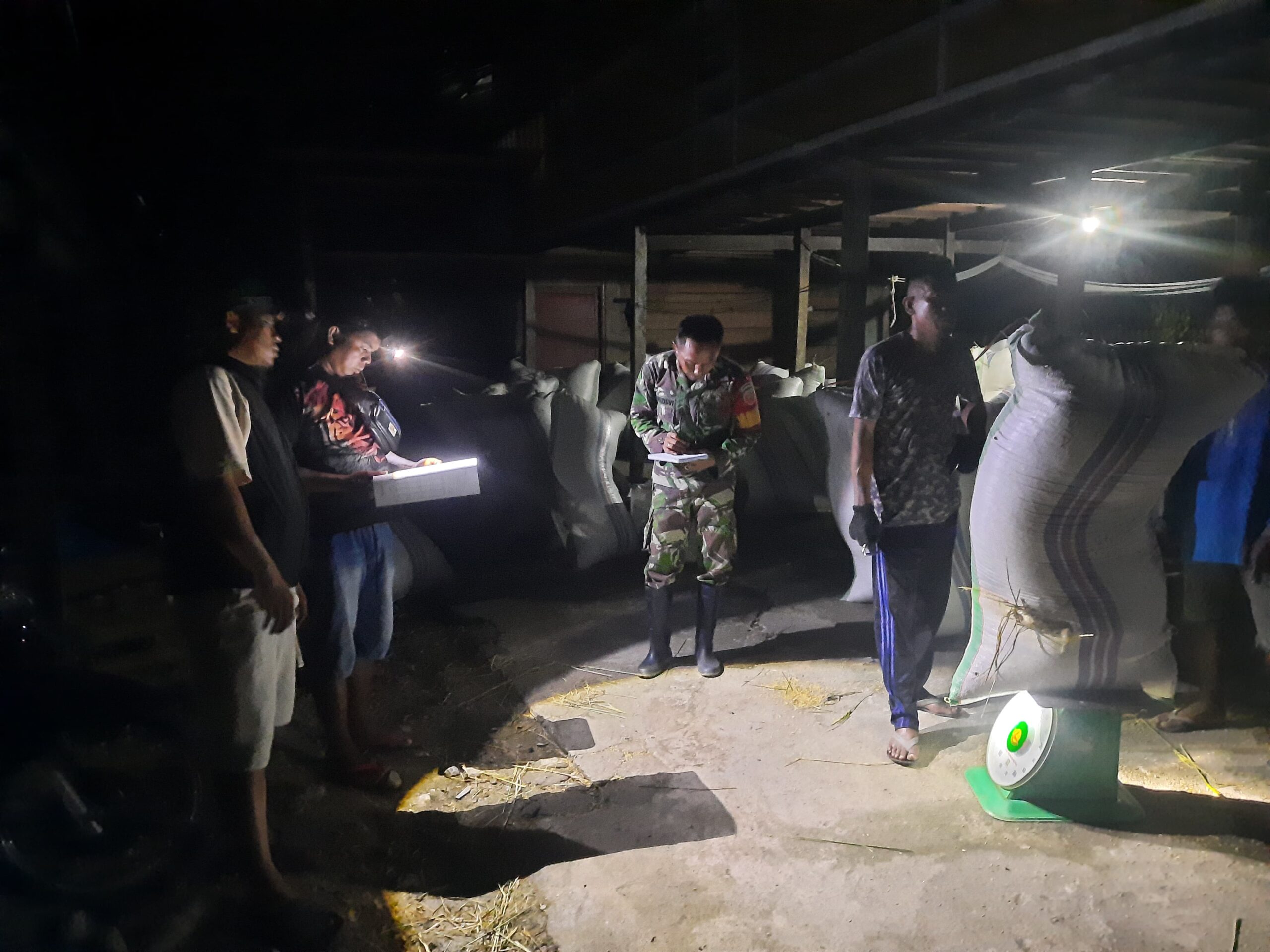 Pinrang_ Babinsa Koramil-04/Paleteang Kodim 1404/Pinrang Serda Amiruddin melaksanakan pendampingan serap gabah petani secara kontinyu dari siang hingga malam hari di Kelurahan Sipatokkong Kecamatan Watang Sawitti Kabupaten Pinrang, Senin (21/04/2025).