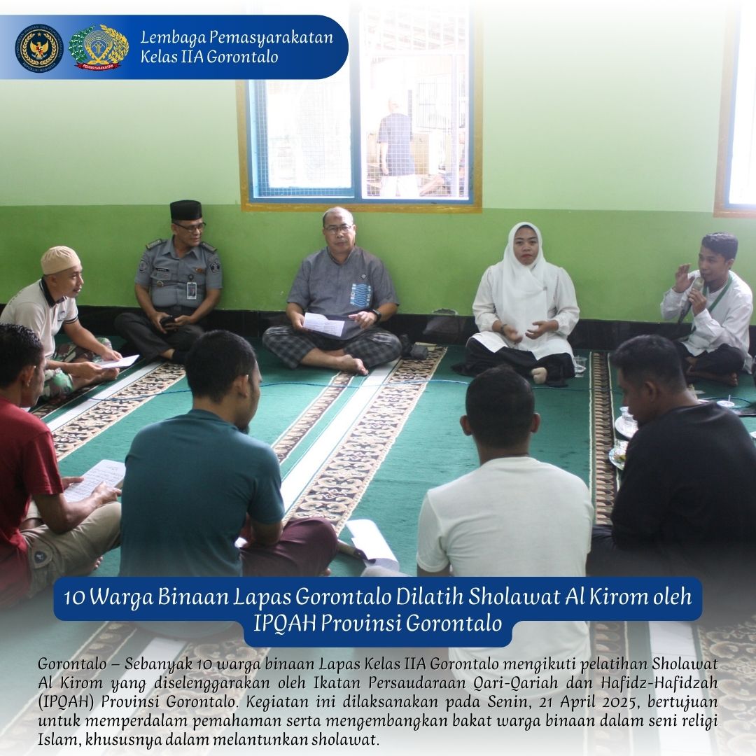Gorontalo _ Selasa (22/04) bertempat diselasar Masjid At-Taubah, tampak warga binaan Lapas Kelas IIA Gorontalo tekun mengikuti pelatihan Sholawat Al Kirom yang diselenggarakan oleh Ikatan Persaudaraan Qari-Qariah dan Hafidz-Hafidzah (IPQAH) Provinsi Gorontalo, Kasdin Lato selaku Kasibinadik Lapas Gorontalo saat ditemui awak media menyampaikan bahwa kegiatan ini adalah salah satu program pembinaan yang akan diikuti oleh warga binaan yang beragama Islam, walaupun tidak semuanya, namun yang paling penting adalah bagaimana kami bisa menanamkan kecintaan kepada Rasulullah SAW, ujar Kasdin yang lebih lanjut menyampaikan bahwa Sholawat Nabi Muhammad adalah bentuk penghormatan dan doa bagi Rasulullah SAW, yang telah menjadi teladan sempurna bagi umat Islam. Sholawat bukan hanya ungkapan cinta dan rindu, tetapi juga sarana untuk mendekatkan diri kepada Allah SWT. Mari kita telaah bersama bacaan sholawat dan maknanya, sambil merenungkan keindahan dan kecemerlangan cahaya ilahi yang disampaikan melalui sholawat.
