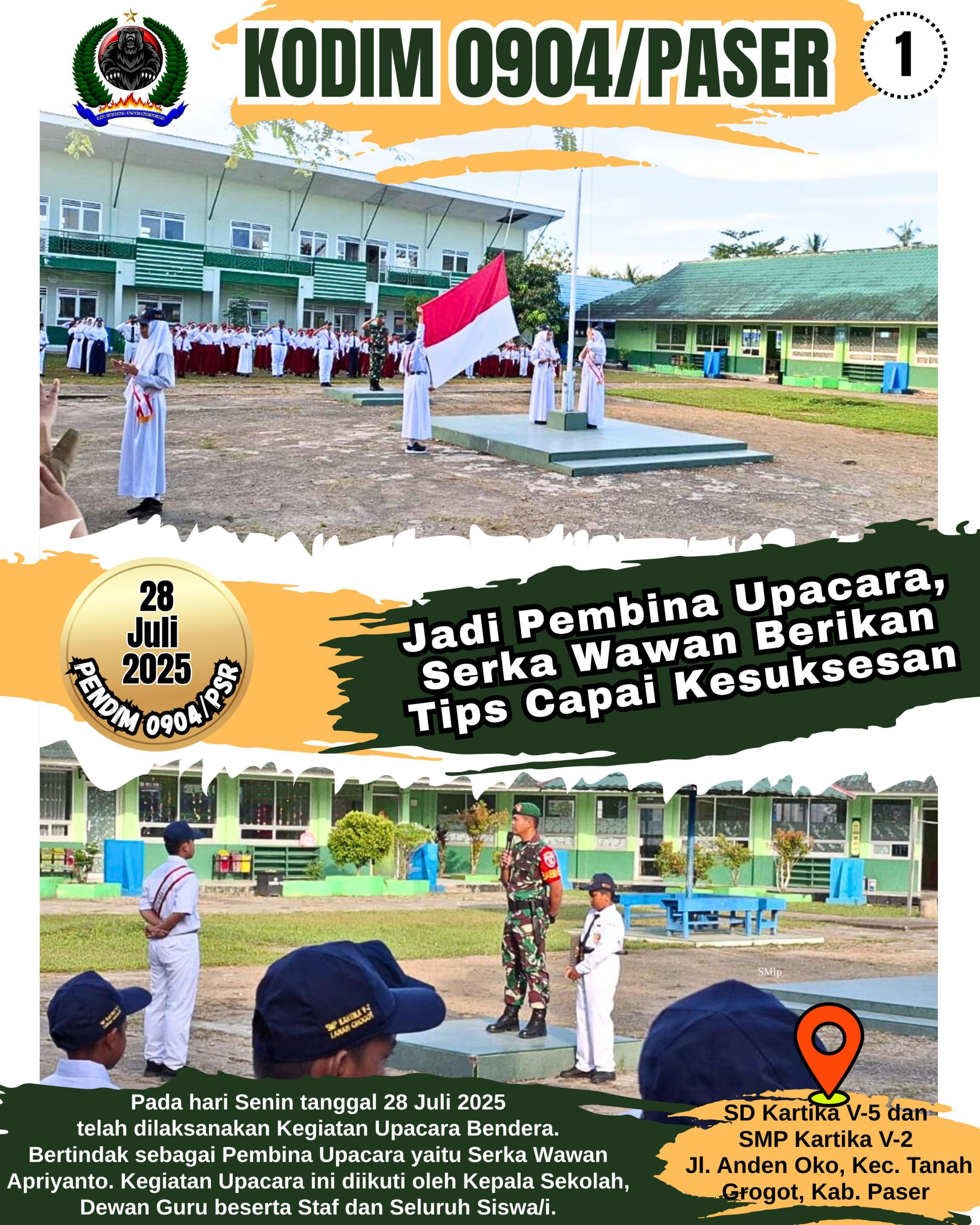 Kodim 0904/Psr, Korem 091/ASN, Kodam VI/Mlw – Bertempat di SD Kartika V-5 dan SMP Kartika V-2 Jl. Anden Oko, Kec. Tanah Grogot, Kab. Paser telah dilaksanakan Kegiatan Upacara Bendera pada hari Senin tanggal 28 Juli 2025, Senin (28/7/25).