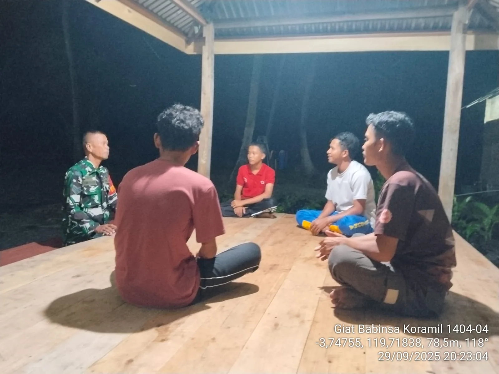Pinrang_ Dalam rangka menjaga keamanan dan ketertiban di wilayah binaan, Babinsa Koramil-04/Paleteang Kodim 1404/Pinrang Serka Amiruddin melaksanakan patroli malam dengan menyambangi warga yang sedang melaksanakan ronda malam di Poskamling Lingkungan Sulili Timur Kelurahan Mamminasae Kecamatan Paleteang Kabupaten Pinrang, Rabu (01/10/2025).