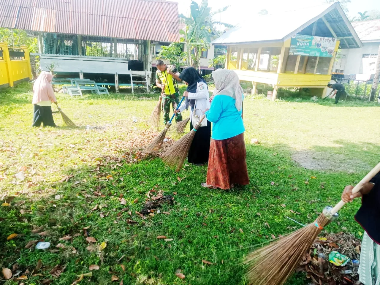 Kegiatan gotong royong tersebut melibatkan ibu-ibu petugas Puskesmas Grong-Grong serta warga sekitar meunasah.