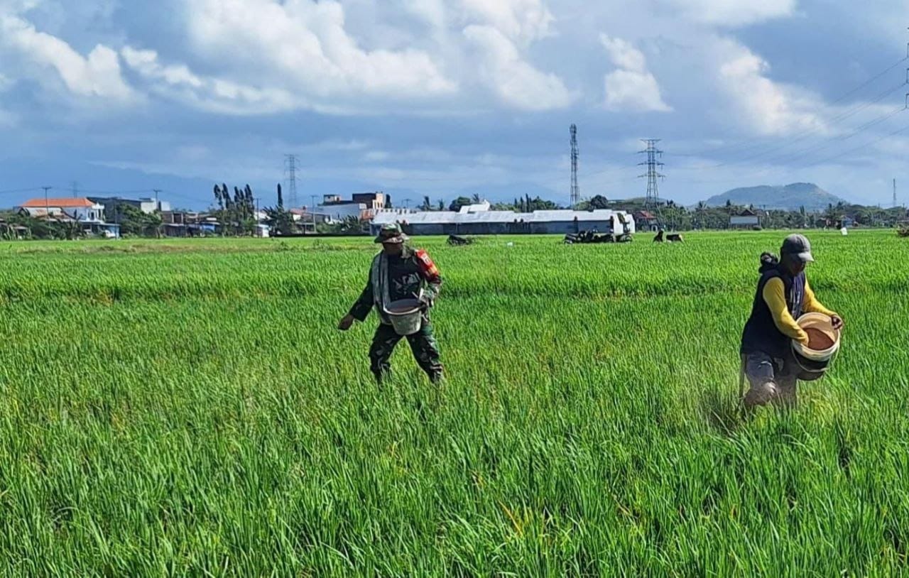 Pinrang_ Untuk meningkatkan hasil panen, Babinsa Koramil-04/Paleteang Kodim 1404/Pinrang Serda Andi Nur Alimin membantu pemupukan padi di persawahan milik bapak Abd. Rahman anggota kelompok tani Sipakaingan di Lingkungan Boki Kelurahan Pammase Kecamatan Tiroang Kabupaten Pinrang, Senin (18/08/2025).