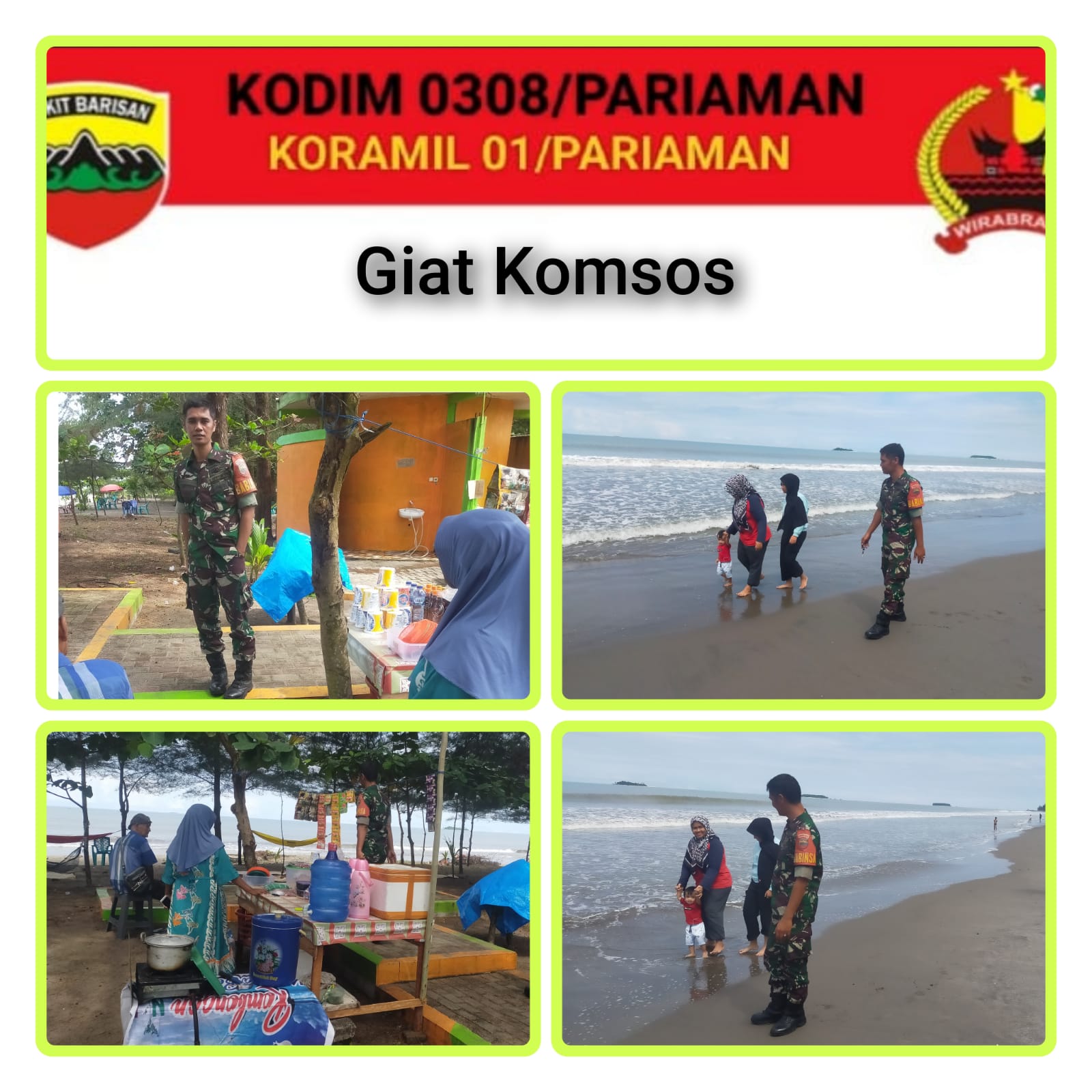 PARIAMAN,- Babinsa Koramil 01/Pariaman Sertu Agus syafni melaksanakan Komunikasi Sosial (Komsos) dengan Warga binaan Pedagang dan Pengunjung Pantai Karan di desa Taluak, dalam rangka bersama sama mengamankan Warga binaan dan pengunjung di pantai karan desa Taluak dan meningkatkan silahturahmi, Senin (26/05/2025).