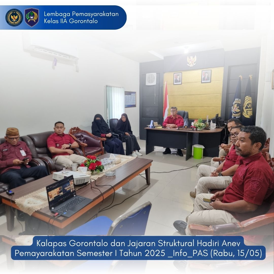 Gorontalo, INFO_PAS – Kepala Lembaga Pemasyarakatan Kelas IIA Gorontalo, Sulistyo Wibowo, bersama jajaran struktural menghadiri kegiatan Analisa dan Evaluasi (Anev) Kinerja Pemasyarakatan Semester I Tahun 2025 yang diselenggarakan oleh Direktorat Jenderal Pemasyarakatan, Kementerian Imigrasi dan Pemasyarakatan RI, Rabu (14/05/2025).