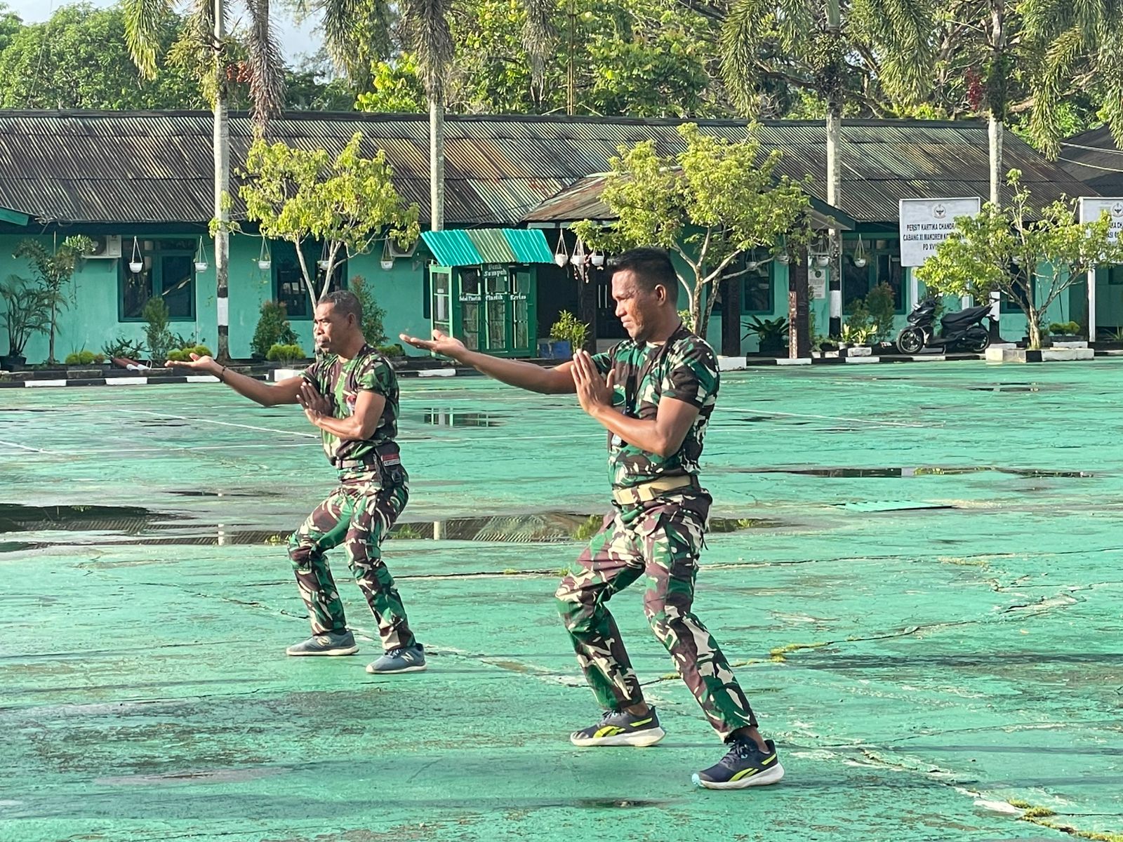 Latihan dimulai dengan pemanasan fisik dasar, dilanjutkan dengan gerakan-gerakan inti Pencak Silat militer seperti sikap hormat, sikap pasang, sikap siap, sikap istirahat dan langkah dasar dan teknik tangkisan. Para prajurit Korem 181/PVT tampak antusias mengikuti setiap sesi latihan dengan penuh semangat.