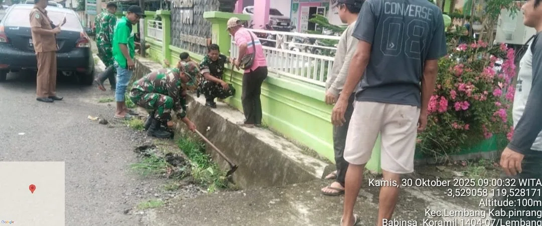 Pinrang_ Dalam rangka menjaga kebersihan lingkungan dan mencegah terjadinya banjir, Babinsa jajaran Koramil-07/Lembang Kodim 1404/Pinrang bersama aparat Kelurahan dan warga melaksanakan kegiatan karya bakti pembersihan saluran air di Lingkungan Buttusappa, Kelurahan Tadokkong, Kecamatan Lembang, Kabupaten Pinrang, Kamis (30/10/2026).