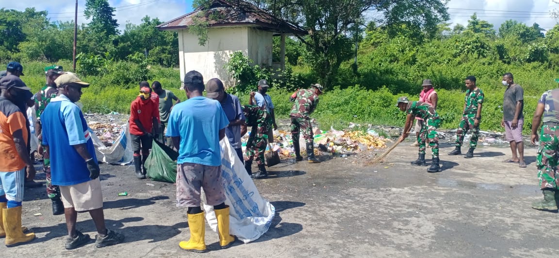Guna mendukung aktifitas warga Sorong Selatan yang nyaman dan bersih Koramil 1807 – 01 Teminabuan mengajak warga masyarakat yang berada di seputaran pasar Kajase guna melaksanakan Karya Bakti pembersihan sampah di seputaran Pasar Kajase yang terletak di Distrik Teminabuan Kab. Sorsel Jumat (13/06/2025).