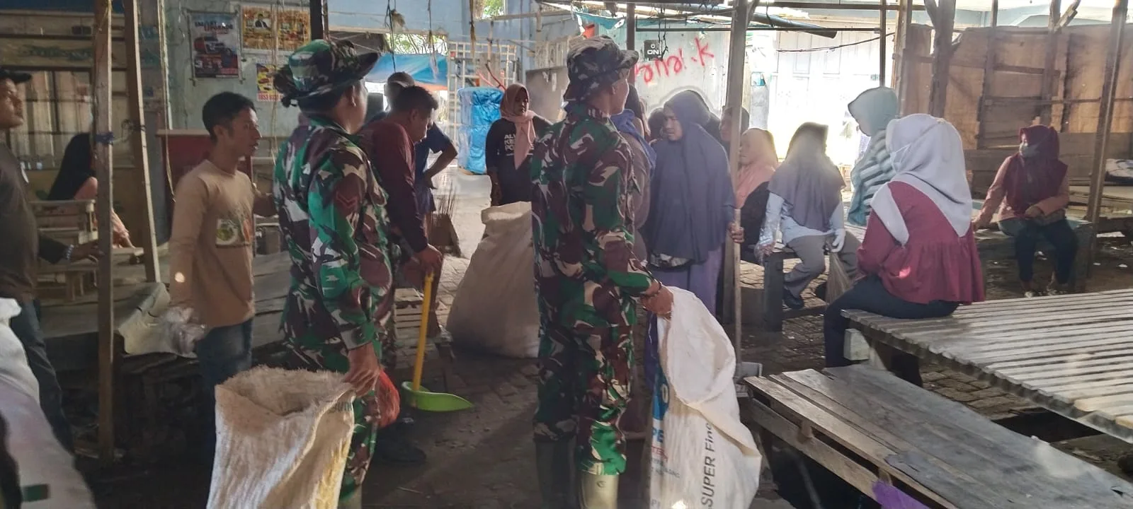 Enrekang _ Menjaga kebersihan lingkungan di wilayah teritorial terus digalakkan Personil Koramil 1419-02/Enrekang dengan warga Melaksanakan karya bakti pembersihan pasar Sentral Enrekang dari tanah, rumpu dan sampah lainnya sepanjang 200 meter di Kel. Juppandang Kec. Enrekang Kab. Enrekang, Sabtu 19/10/2025