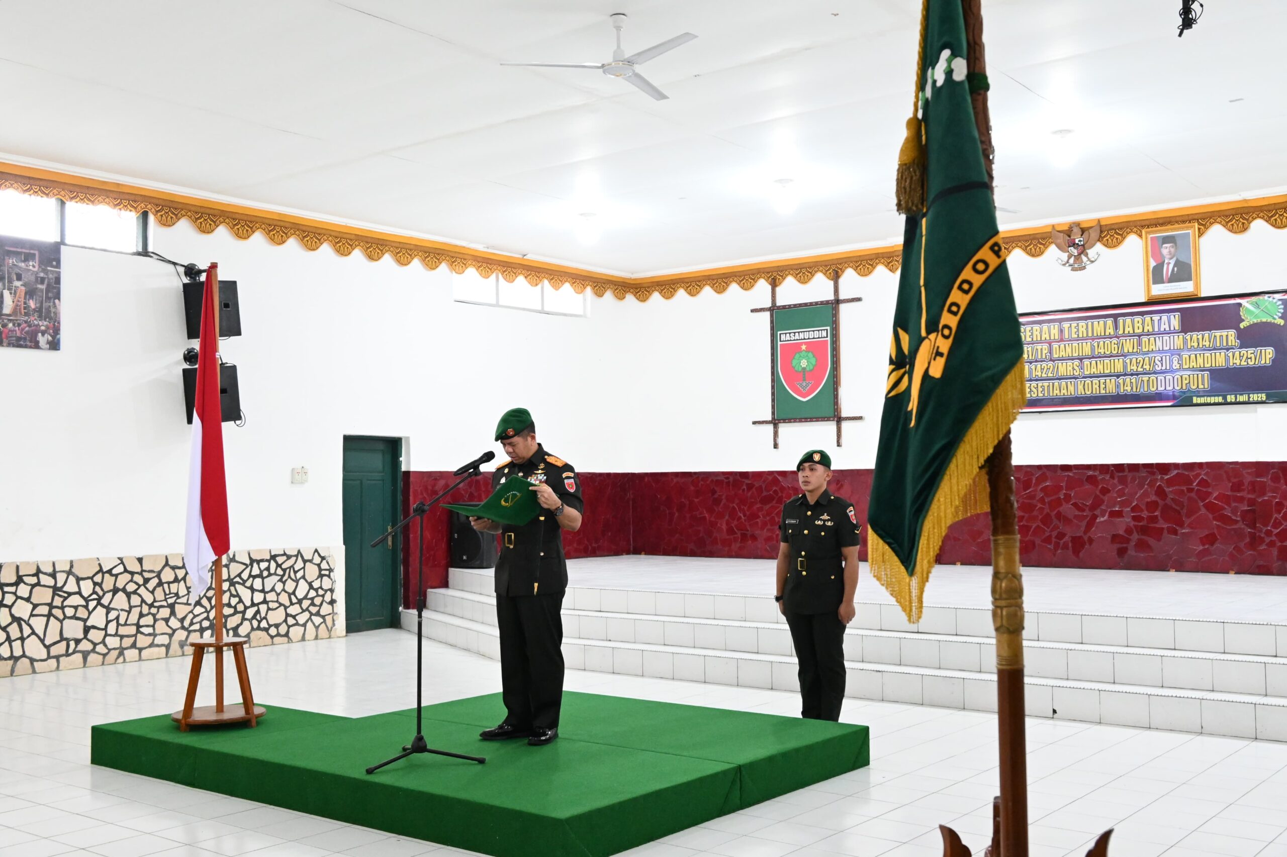 Pejabat yang melaksanakan serah terima yaitu Kasiter Kasrem 141/Tp dari Kolonel Inf Rahmat kepada Letkol Inf Ruly Eko Suryawan, S.Sos., Dandim 1406/Wajo dari Letkol Inf Wahyu Yunus, S.I.P. kepada Letkol Inf Harianto, S.I.P., Dandim 1414/Tator dari Letkol Arm Bani Kelana sepang kepada Letkol Inf Armal, Dandim 1415 Selayar dari Letkol Inf Nanang Agung Wibowo kepada Letkol Czi Yudo Harianto, Dandim 1422 Maros dari Letkol Arm Nikolas,s Kepada Letkol Arm Agung Yuhono, Dandim 1424/Sinjai dari Letkol Arm Dian Akhmad kepada Letkol Arm Arif Hartanto dan Dandim 1425 Jeneponto dari Letkol Inf Muhammad Amin kepada Letkol Inf Abdul Muthalib.