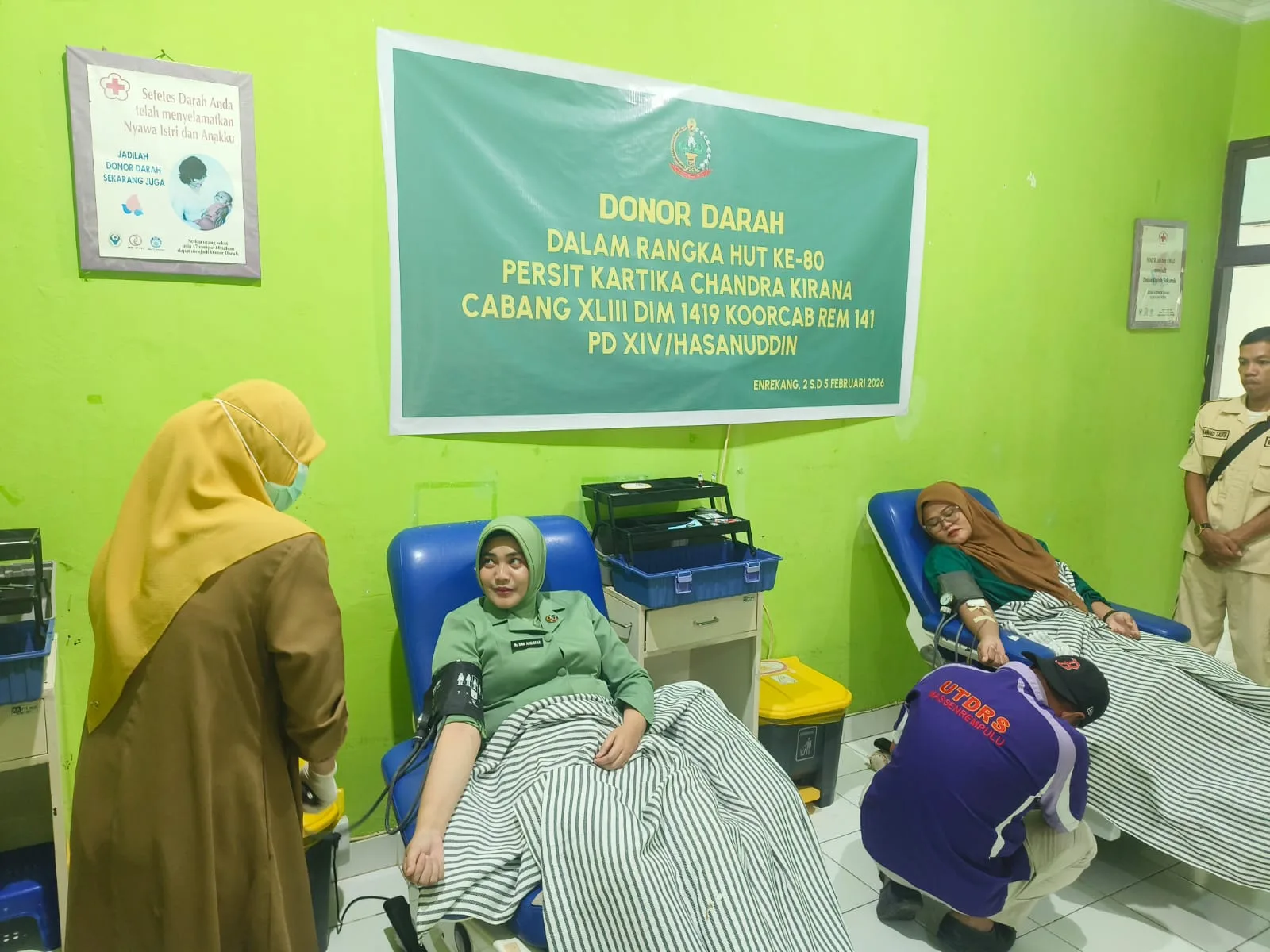 Enrekang – Persit Kartika Chandra Kirana (KCK) Cabang XLIII Kodim 1419/Enrekang menggelar kegiatan bakti sosial donor darah dalam rangka memperingati HUT ke-80 Persit Kartika Chandra Kirana. Kegiatan tersebut dilaksanakan di UTD RSUD Massenrempulu, Jl. Jenderal Sudirman, Kelurahan Galonta, Kecamatan Enrekang, Kabupaten Enrekang, pada Senin (02/02/2026).