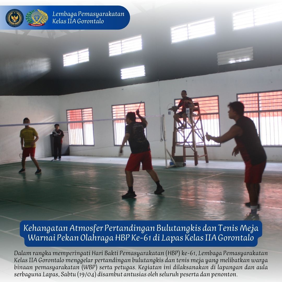 Gorontalo – Dalam rangka memperingati Hari Bakti Pemasyarakatan (HBP) ke-61, Lembaga Pemasyarakatan Kelas IIA Gorontalo menggelar pertandingan bulutangkis dan tenis meja yang melibatkan warga binaan pemasyarakatan (WBP) serta petugas. Kegiatan ini dilaksanakan di lapangan dan aula serbaguna Lapas, Sabtu (19/04) disambut antusias oleh seluruh peserta dan penonton.