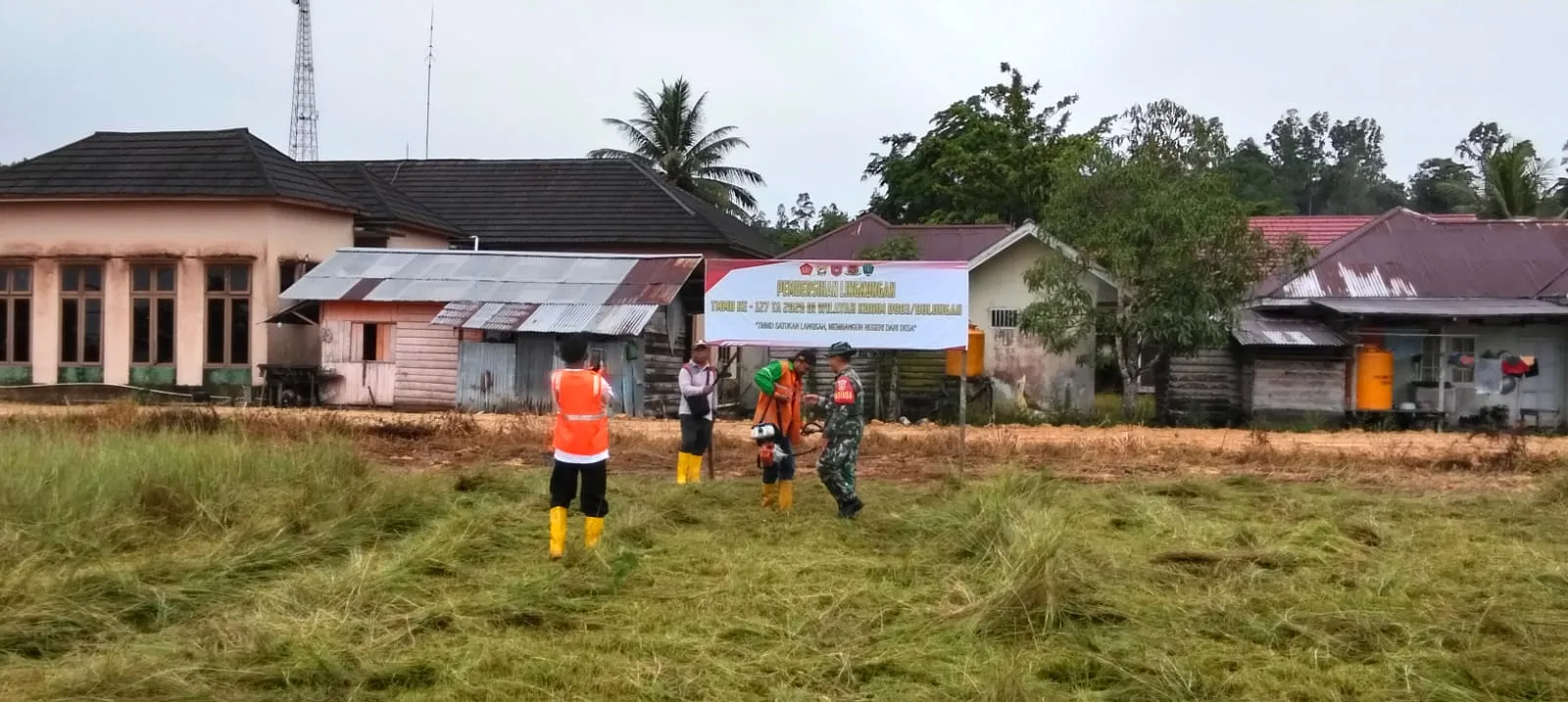 Kegiatan kerja bakti tersebut dilakukan dengan membersihkan area lapangan dan lingkungan sekitar desa. Dengan menggunakan alat sederhana seperti parang dan alat pemotong rumput, anggota Satgas TMMD bersama masyarakat bergotong royong membersihkan rumput liar dan merapikan lingkungan agar terlihat lebih bersih dan rapi.