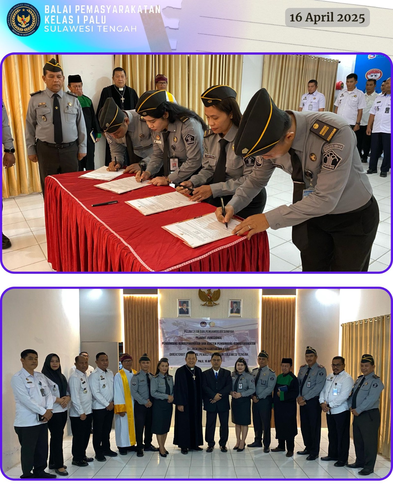 Palu, 16 April 2025 – Suasana khidmat mewarnai ruang aula Balai Pemasyarakatan (Bapas) Kelas I Palu pada hari ini. Sebanyak empat pejabat fungsional dari Bapas Kelas I Palu dan Bapas Kelas II Luwuk resmi dilantik dan diambil sumpahnya dalam sebuah acara yang dihadiri oleh jajaran Kepala Unit Pelaksana Tugas (UPT) Pemasyarakatan se-Kota Palu dan Kabupaten Sigi.