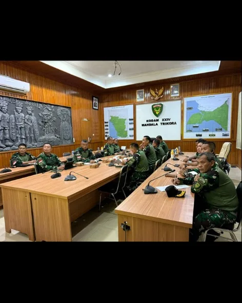 Rapat tersebut diikuti oleh para Asisten Kodam, perwira staf operasi, serta perwakilan satuan kewilayahan jajaran Kodam XXIV/Mandala Trikora, baik yang hadir langsung di Makodam maupun yang mengikuti melalui Vicon.