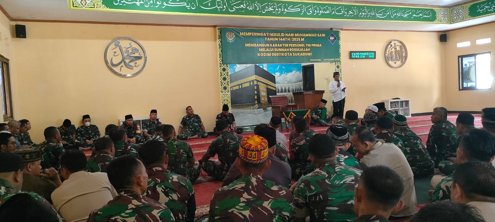Kodim 0607/Kota Sukabumi menggelar peringatan Maulid Nabi Muhammad SAW 1447 H/2025 M di Masjid Abubakar Kodim 0607. Dengan ini mengusung tema “Membangun Karakter Personel TNI Prima Melalui Sunah Rasulullah” sebagai wujud upaya pembinaan mental dan spiritual prajurit TNI.(Senin,08/09/2025)