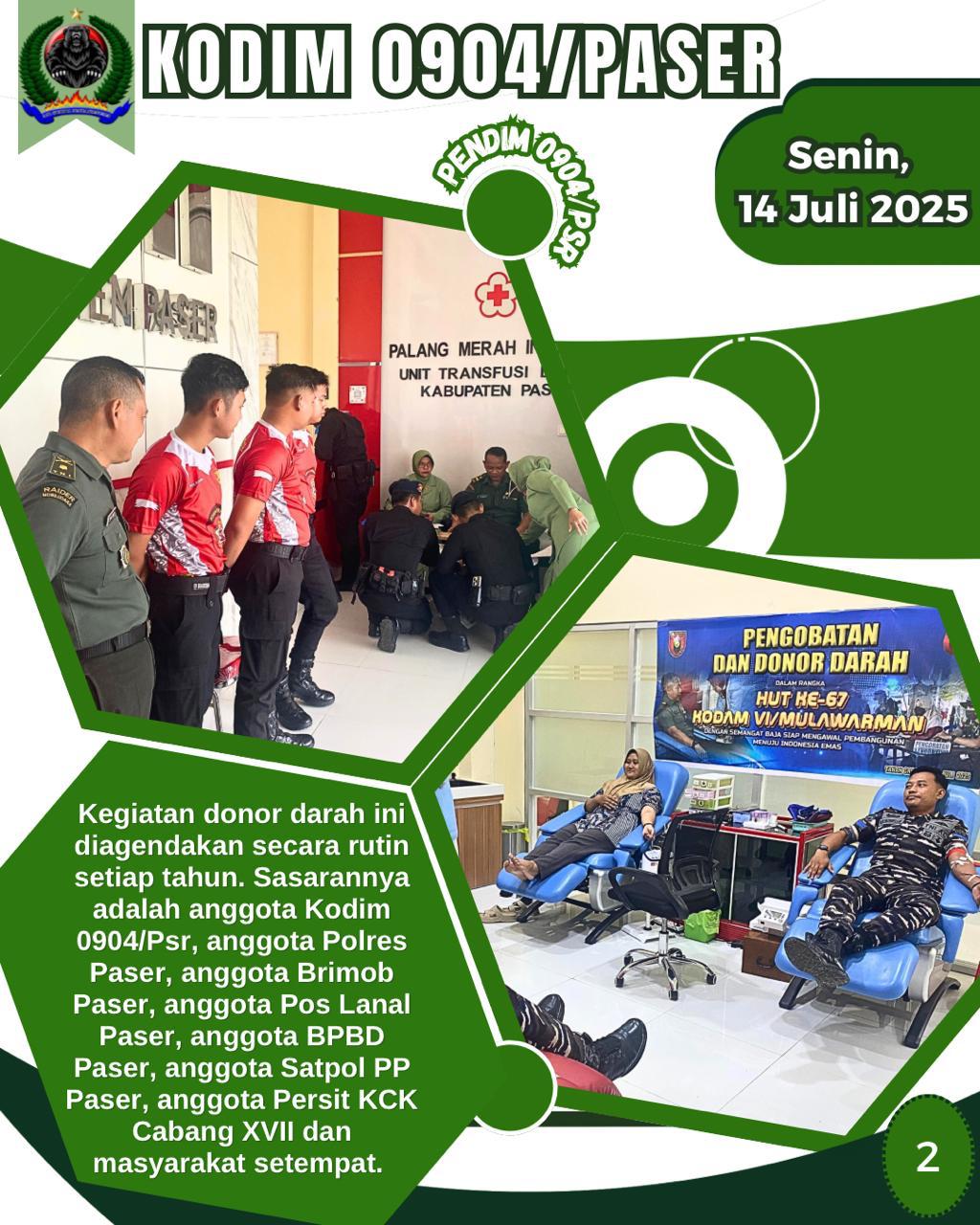 Kegiatan donor darah ini diagendakan secara rutin setiap tahun. Sasarannya adalah anggota Kodim 0904/Psr, anggota Polres Paser, anggota Brimob Paser, anggota Pos Lanal Paser, anggota BPBD Paser, anggota Satpol PP Paser, anggota Persit KCK Cabang XVII dan masyarakat setempat.