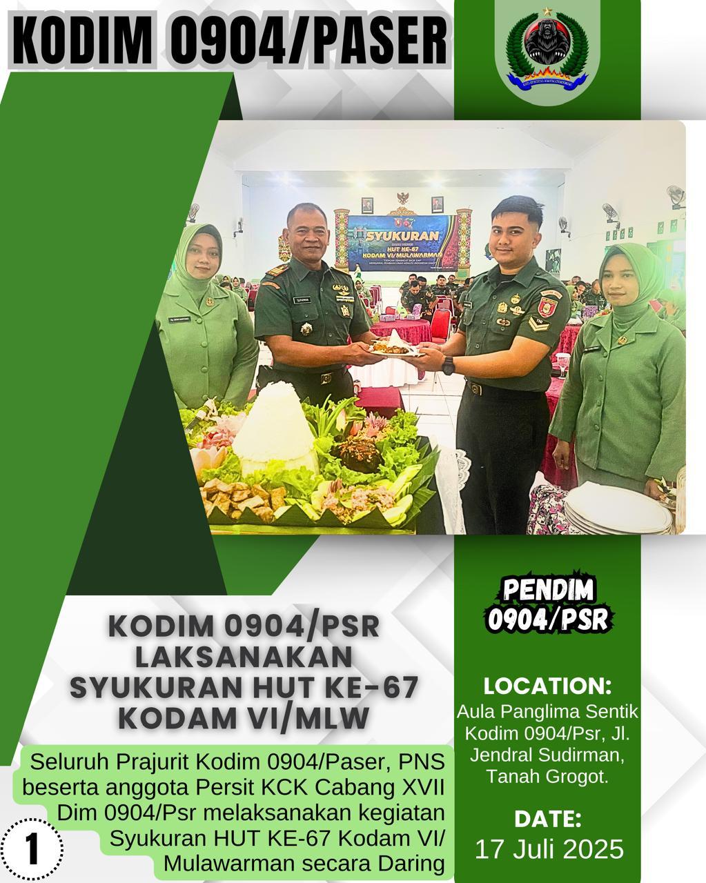 Kodim 0904/Psr, Korem 091/ASN, Kodam VI/Mlw – Seluruh Prajurit Kodim 0904/Paser, PNS beserta anggota Persit KCK Cabang XVII Dim 0904/Psr melaksanakan kegiatan Syukuran HUT KE-67 Kodam VI/Mulawarman secara Daring bertempat di Aula Panglima Sentik Kodim 0904/Psr, Jl. Jendral Sudirman, Tanah Grogot.