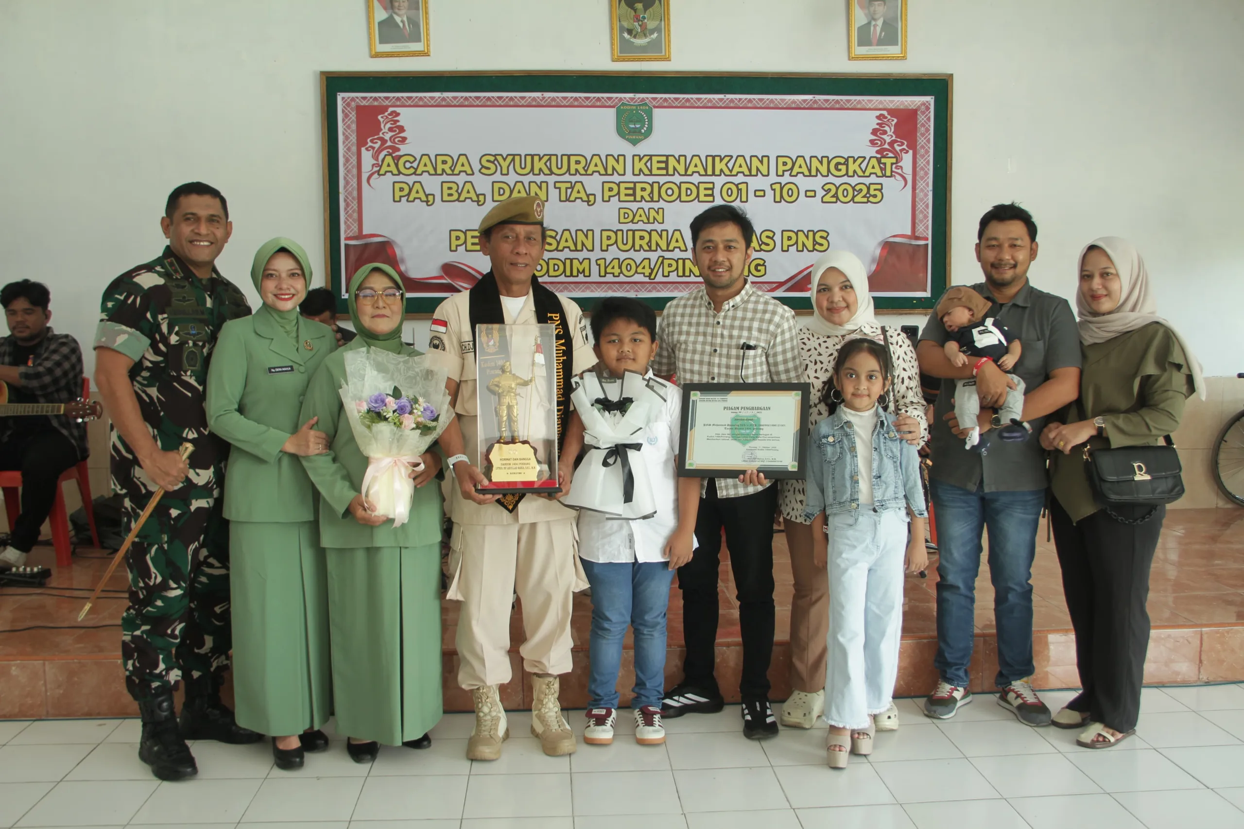 Pinrang_ Kodim 1404/Pinrang menggelar acara syukuran kenaikan pangkat bagi Perwira, Bintara, dan Tamtama, sekaligus pelepasan Pegawai Negeri Sipil (PNS) yang memasuki masa purna tugas, bertempat di Pendopo Makodim 1404 Pinrang, Kelurahan Laleng Bata, Kecamatan Paleteang, Kabupaten Pinrang, Sabtu (11/10/2025).