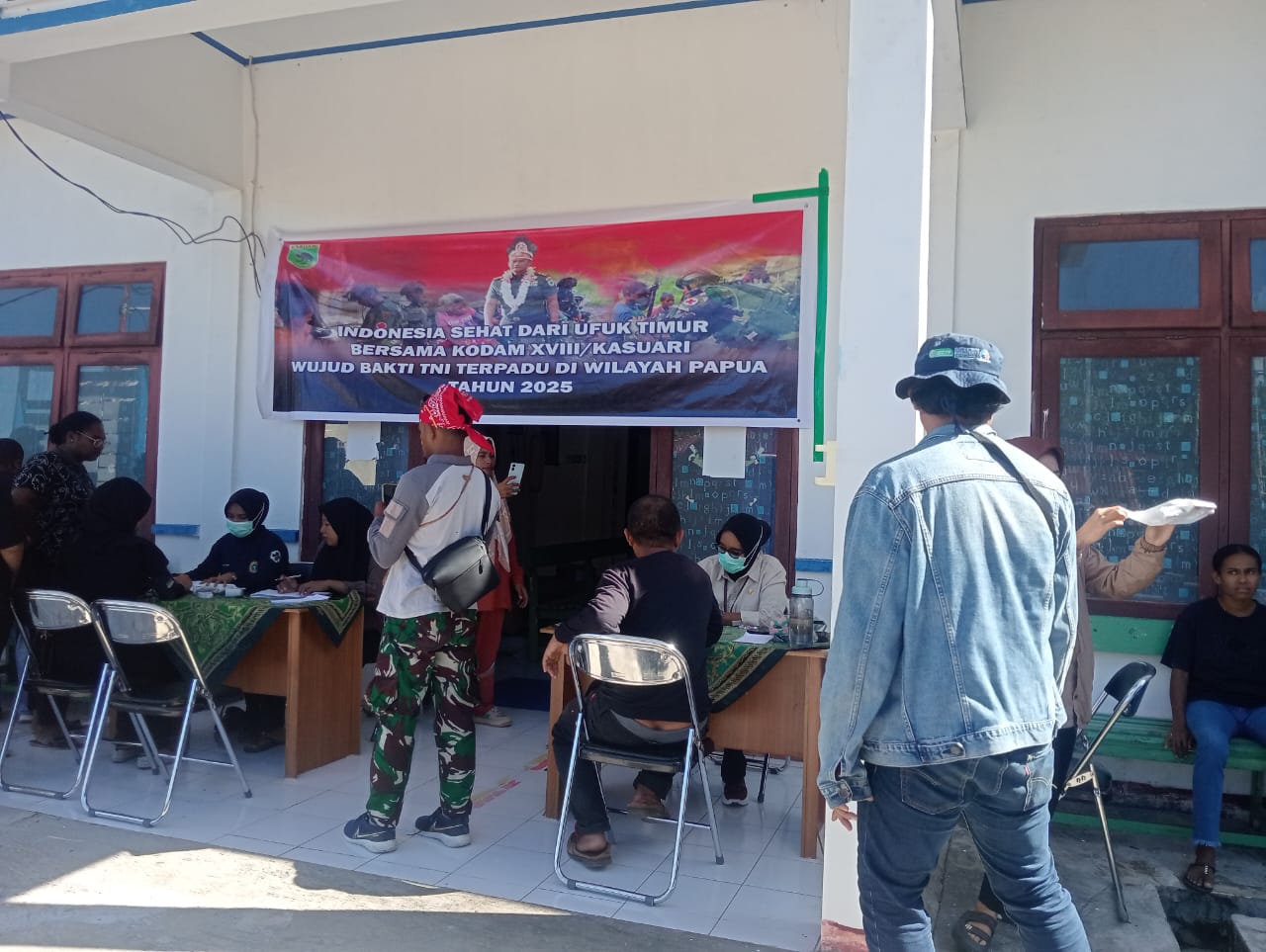 Tenaga Kesehatan Puskesmas Saonek juga memberikan dukungan Kodim 1805/RA dalam menyukseskan program bakti kesehatan di desa-desa. “Hari ini merupakan hari yang penuh menyenangkan”, Kami juga menyoroti program kartu sehat gratis dari pemerintah pusat di bawah Presiden Prabowo, serta mengajak masyarakat untuk mendaftar cek kesehatan gratis di puskesmas.