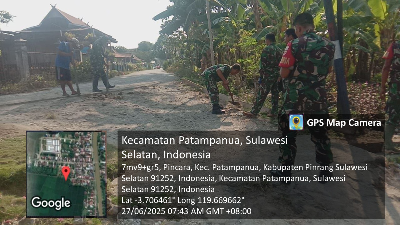 Pinrang_ Selalu ada disetiap kegiatan di wilayah binaannya, anggota Babinsa Koramil-05/Patampanua Kodim 1404/Pinrang bersama warga melaksanakan kerja bakti pengecoran jalan Desa sepanjang 100 meter di Dusun Sali-sali Desa Pincara Kecamatan Patampanua Kabupaten Pinrang, Jum’at (27/06/2025).
