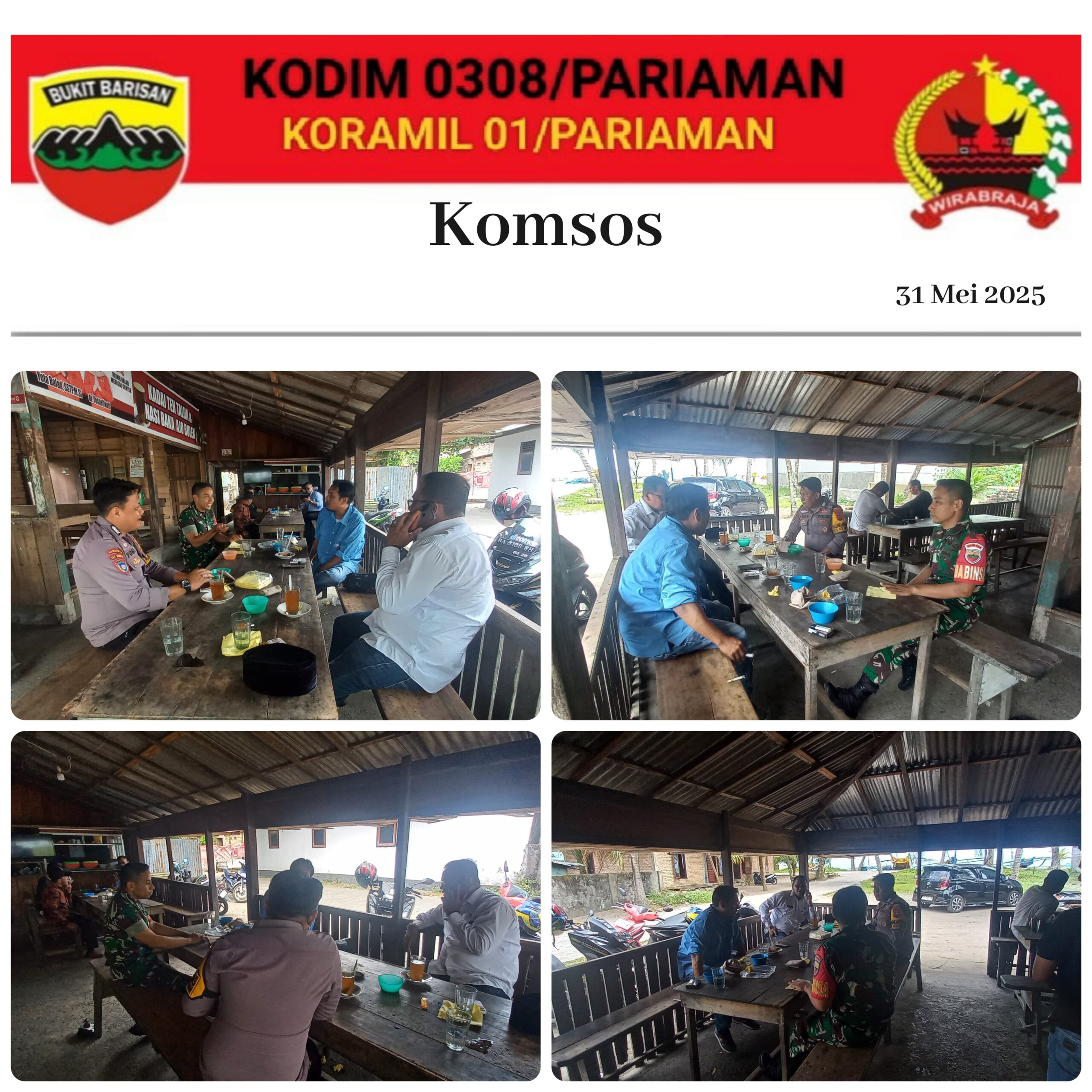 PARIAMAN,– Babinsa Koramil 01/Pariaman jajaran Kodim 0308/Pariaman Serda Kastrialdi melaksanakan Komunikasi Sosial (Komsos) bersama masyarakat desa binaan di Desa Balai Naras Kecamatan Pariaman Utara, Kota Pariaman, dengan tujuan menciptakan kedekatan bersama warga binaan, Minggu (31/05/2025).