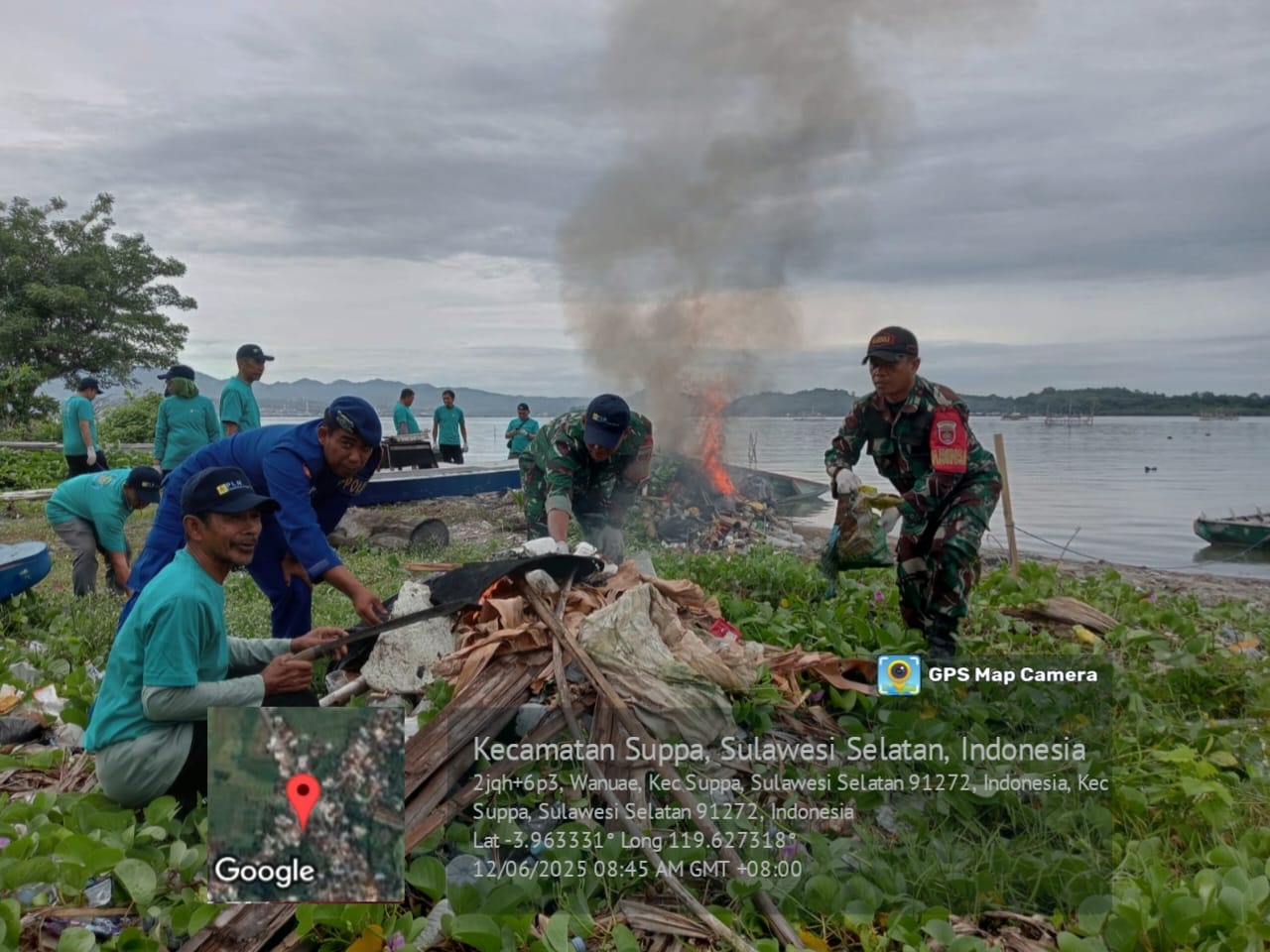 Pinrang_ Peduli kebersihan Lingkungan, Koramil-01/Suppa bersama Forkopimcam dan stake holder terkait lainnya dan warga setempat mengadakan kegiatan kerja bakti pembersihan pesisir pantai Marabombang di Lingkungan Wanuae Kelureahan Watang Suppa Kecamatan Suppa Kabupaten Pinrang, Jum’at (13/06/2025).