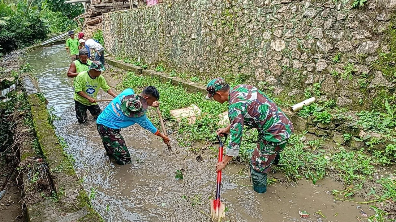 Enrekang _ Anggota Koramil 1419-03/Baraka Kodim 1419/Enrekang yang dipimpin oleh Peltu Arsyad bersama masyarakat Melaksanakan karya bakti pembersihan Dreinase dari tanah, rumput dan sampah lainnya dalam rangka mengantisipasi terjadinya luapan air di Dusun Kalepe Desa Eran Batu Kec. Buntu Batu kab. Enrekang, Jumat (10/10/2025).