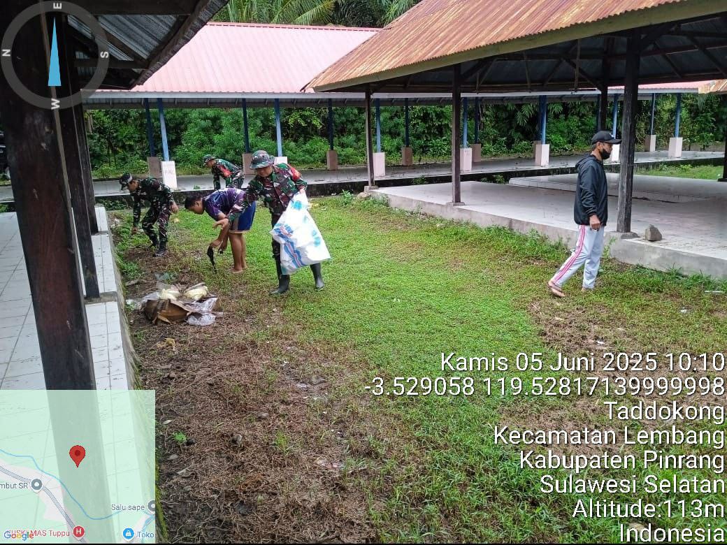 Pinrang_ Peduli terhadap kebersihan Lingkungan, Babinsa Koramil-07/Lembang Kodim 1404/Pinrang beserta warga melaksanakan aksi pembersihan pasar Tuppu di Kelurahan Tadokkong Kecamatan Lembang Kabupaten Pinrang, Kamis (05/06/2025).