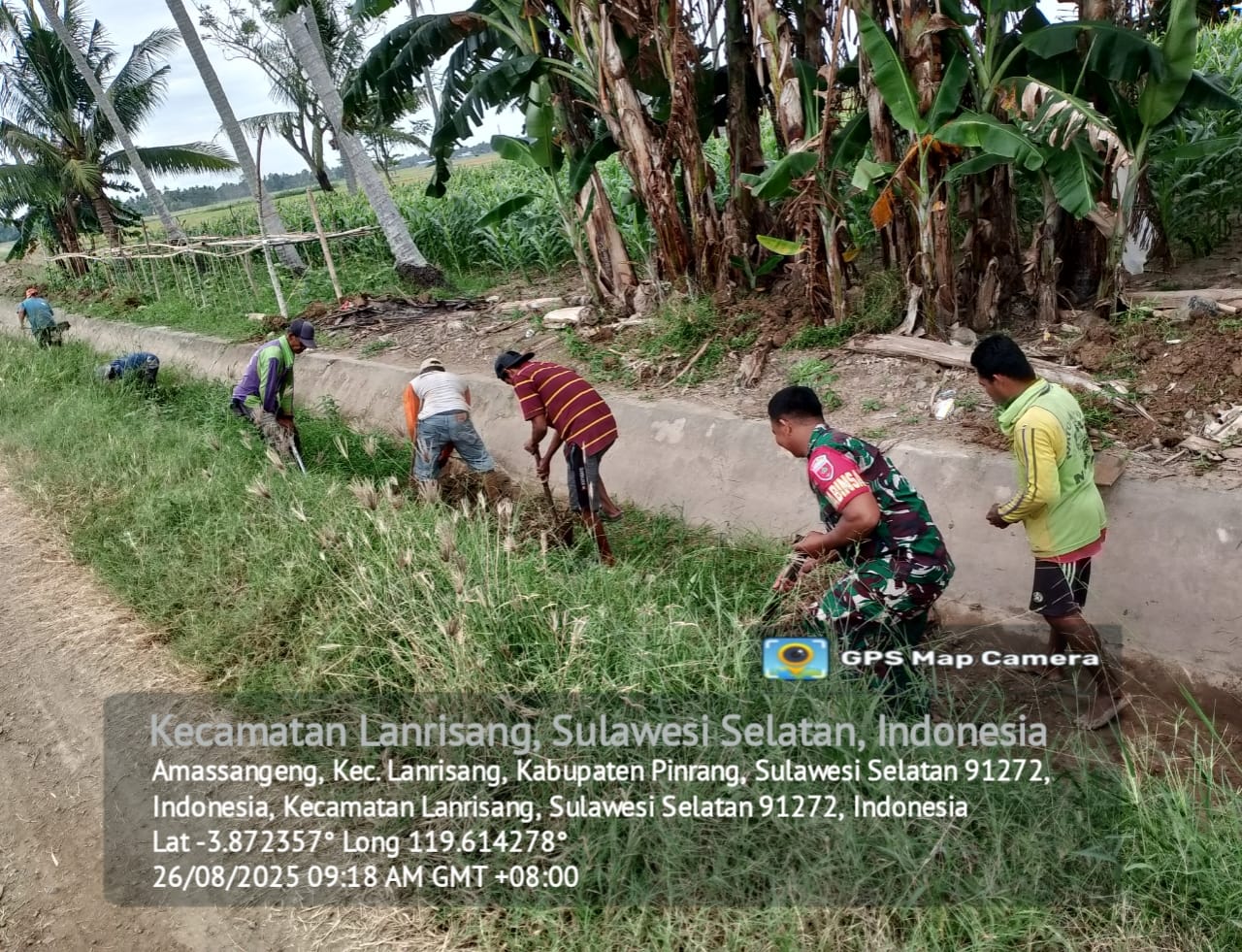 Pinrang_ Sebagai bentuk kepedulian terhadap kebersihan lingkungan, Babinsa jajaran Koramil-08/Lanrisang Kodim 1404/Pinrang bersama warga melaksanakan kerja bakti pembersihan saluran air di Dusun Labalakang Desa Ammasangan Kecamatan Lanrisang Kabupaten Pinrang, Selasa (26/08/2025).