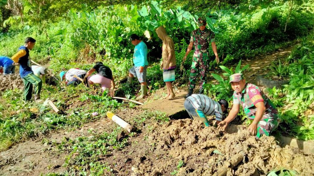 Enrekang — Anggota Koramil 1419-04/Alla bersama pemerintah setempat dan warga Melaksankan karya bakti pembersihan selokan dari tanah, rumput dan sampah lainnya sepanjang 150 meter di Desa Mampu Kec. Anggeraja Kab. Enrekang, Minggu 21/09/2025