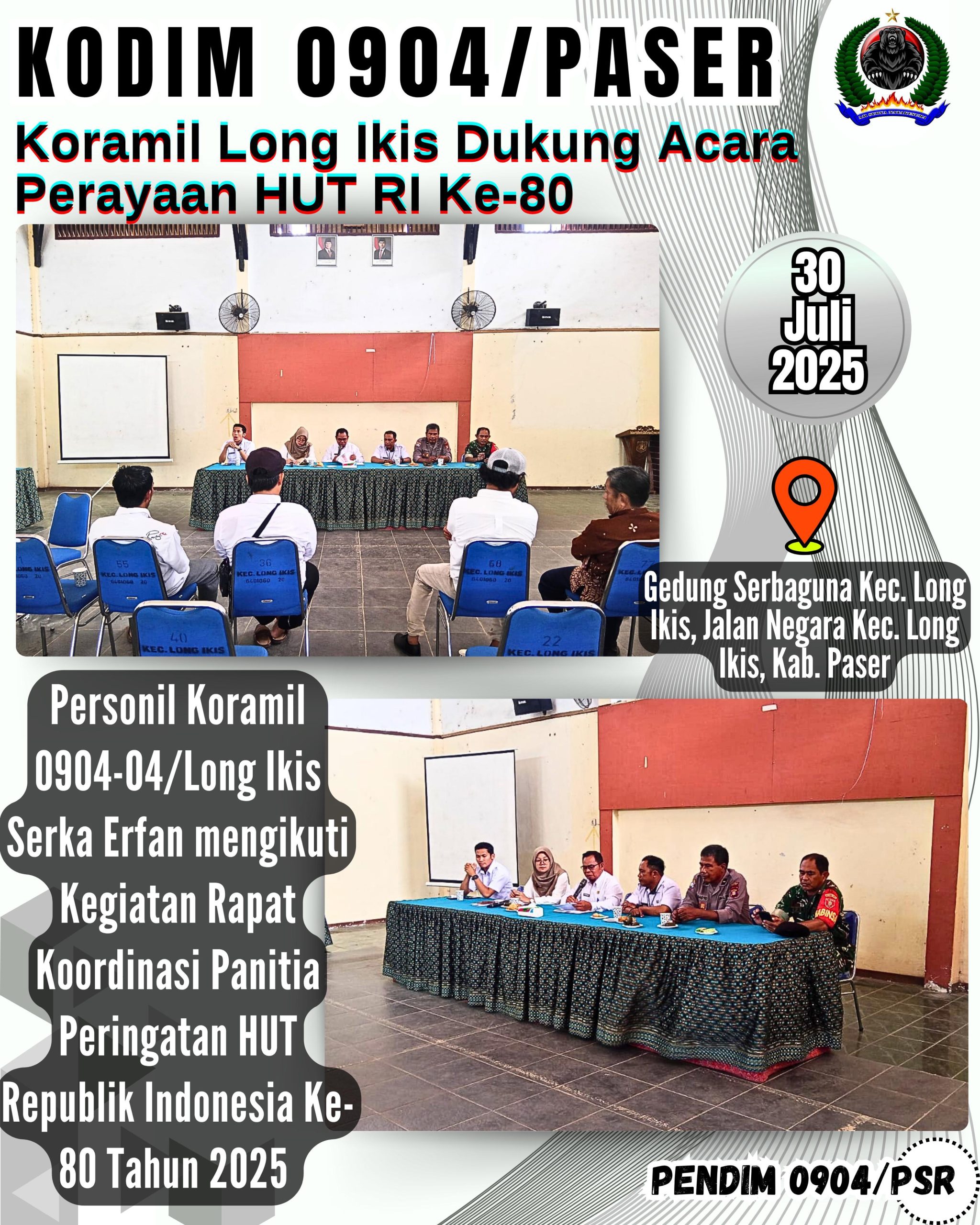 Kodim 0904/Psr, Korem 091/ASN, Kodam VI/Mlw – Personil Koramil 0904-04/Long Ikis Serka Erfan mengikuti Kegiatan Rapat Koordinasi Panitia Peringatan HUT Republik Indonesia Ke-80 Tahun 2025 yang bertempat di Gedung Serbaguna Kec. Long Ikis, Jalan Negara Kec. Long Ikis, Kab. Paser, Rabu (30/7/25).