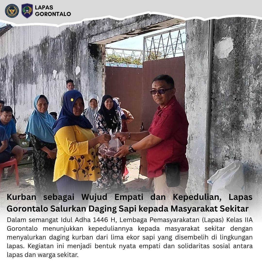 Gorontalo – INFO_PAS – Dalam semangat Idul Adha 1446 H, Lembaga Pemasyarakatan (Lapas) Kelas IIA Gorontalo menunjukkan kepeduliannya kepada masyarakat sekitar dengan menyalurkan daging kurban dari lima ekor sapi yang disembelih di lingkungan lapas. Kegiatan ini menjadi bentuk nyata empati dan solidaritas sosial antara lapas dan warga sekitar.