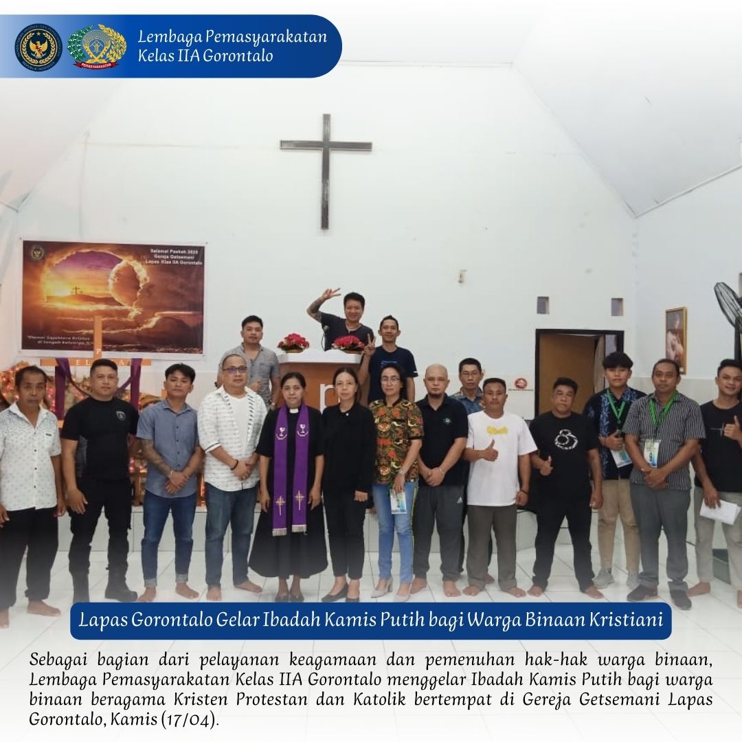 Gorontalo, – Sebagai bagian dari pelayanan keagamaan dan pemenuhan hak-hak warga binaan, Lembaga Pemasyarakatan Kelas IIA Gorontalo menggelar Ibadah Kamis Putih bagi warga binaan beragama Kristen Protestan dan Katolik bertempat di Gereja Getsemani Lapas Gorontalo, Kamis (17/04).