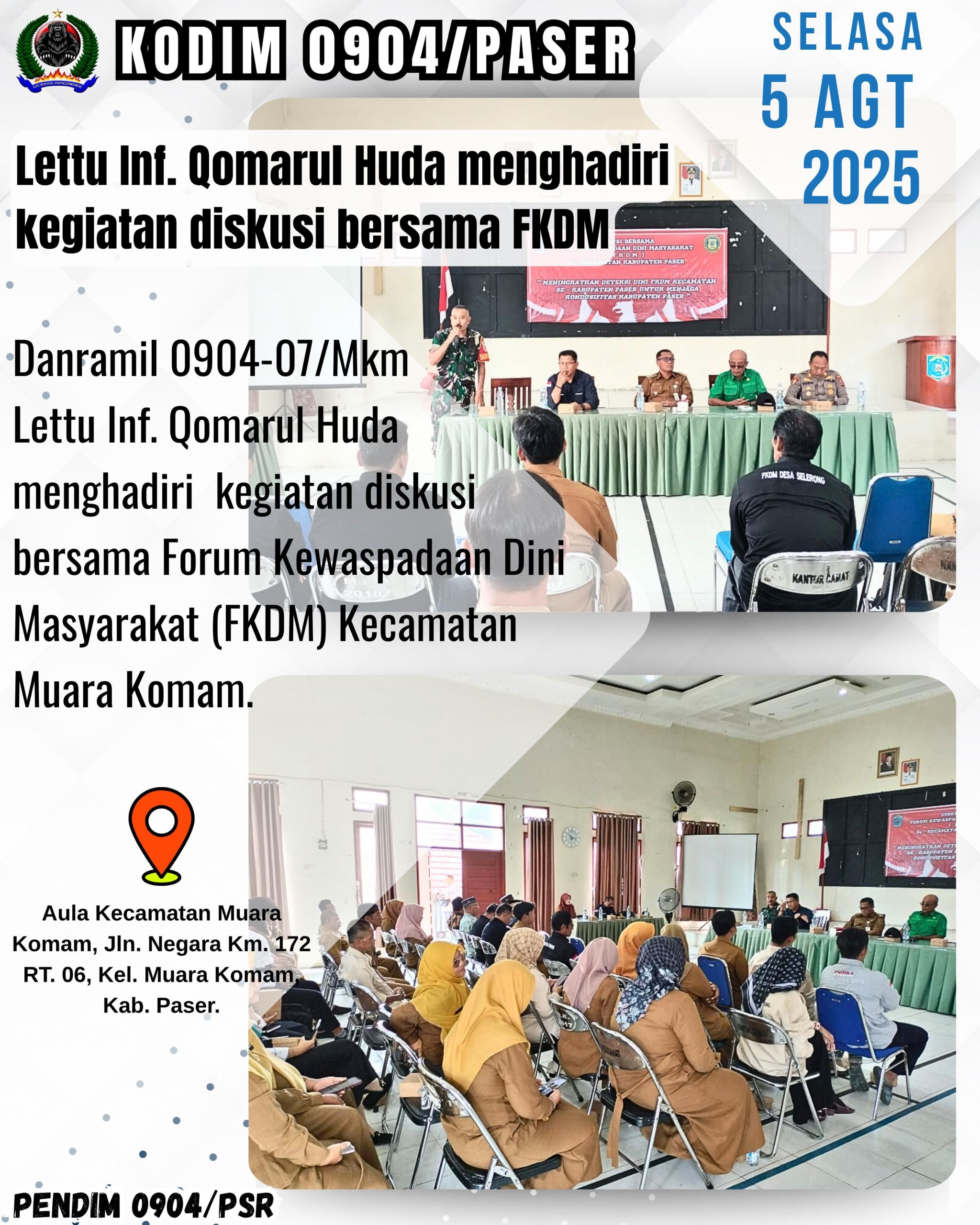 Kodim 0904/Psr, Korem 091/ASN, Kodam VI/Mlw – Danramil 0904-07/Mkm Lettu Inf. Qomarul Huda menghadiri kegiatan diskusi bersama Forum Kewaspadaan Dini Masyarakat (FKDM) Kecamatan Muara Komam bertempat di Aula Kecamatan Muara Komam, Jln. Negara Km. 172 RT. 06, Kel. Muara Komam, Kab. Paser, Selasa (5/8/2025).