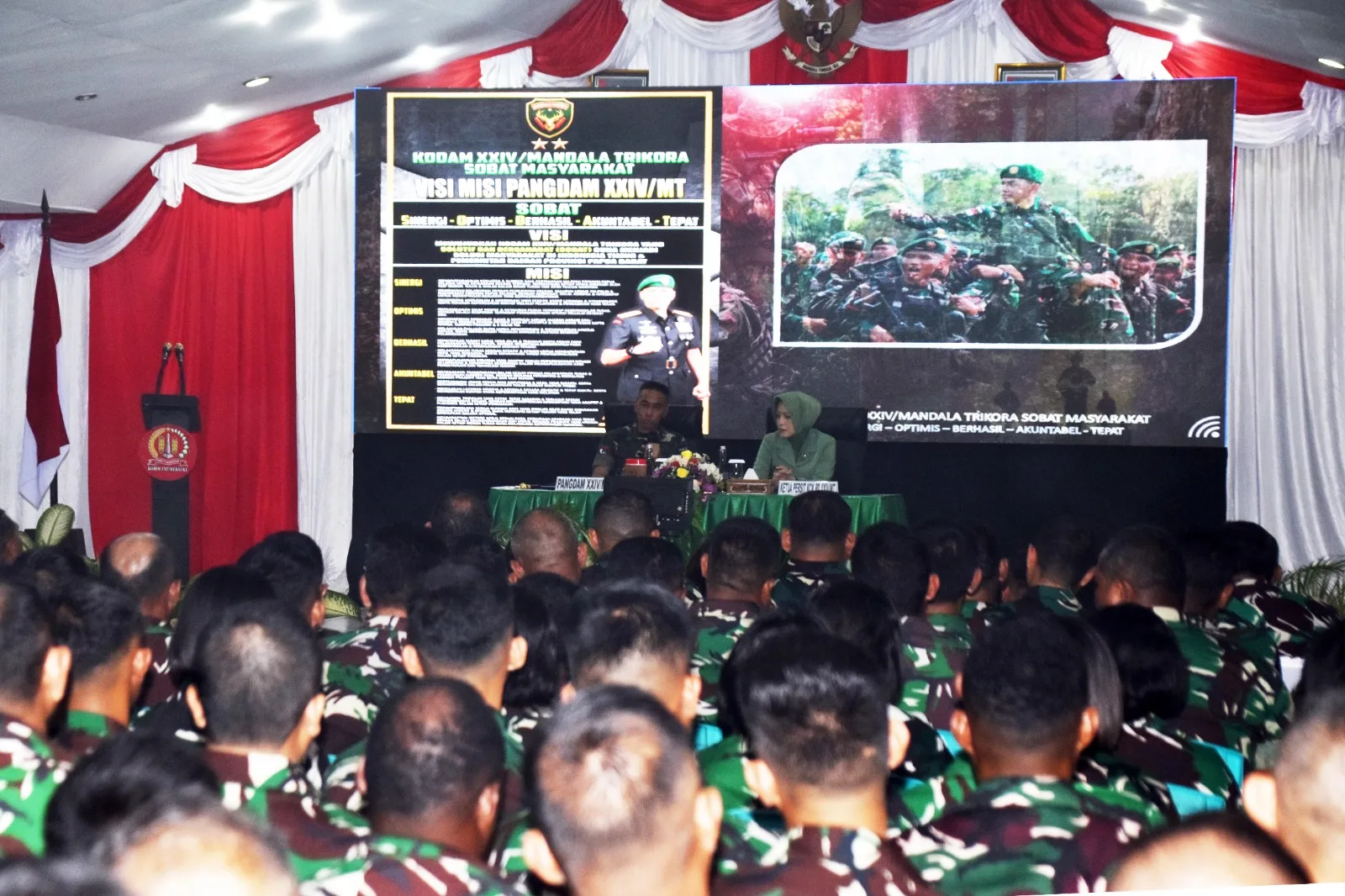 Nampak hadir Kasdam XXIV/MT Brigjen TNI Eventius Teddy Danarto, Irdam XXIV/MT Brigjen TNI Dwi Endrosasongko, S.Sos., M.I.P., Danrem 174/ATW Brigjen TNI Andy Setyawan, S.Sos., M.I.P., para pejabat utama Kodam XXIV/MT dan Korem 174/ATW, Ketua Persit KCK Cabang XVI Kodim 1707/Merauke Ny. Asti Dili Eko Setyawan, serta para Pengurus Persit KCK PD XXIV/MT.