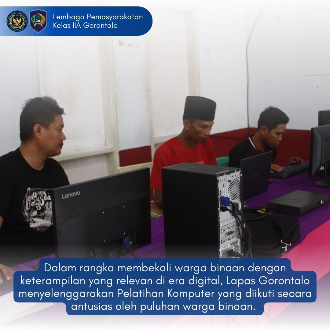 Gorontalo – INFO_PAS –Senin (19/05) Dalam rangka membekali warga binaan dengan keterampilan yang relevan di era digital, Lembaga Pemasyarakatan Kelas IIA Gorontalo menyelenggarakan Pelatihan Komputer yang diikuti secara antusias oleh puluhan warga binaan. Kegiatan ini merupakan bagian dari program pembinaan kemandirian yang bertujuan untuk menyiapkan warga binaan agar lebih siap menghadapi dunia kerja setelah bebas nanti.