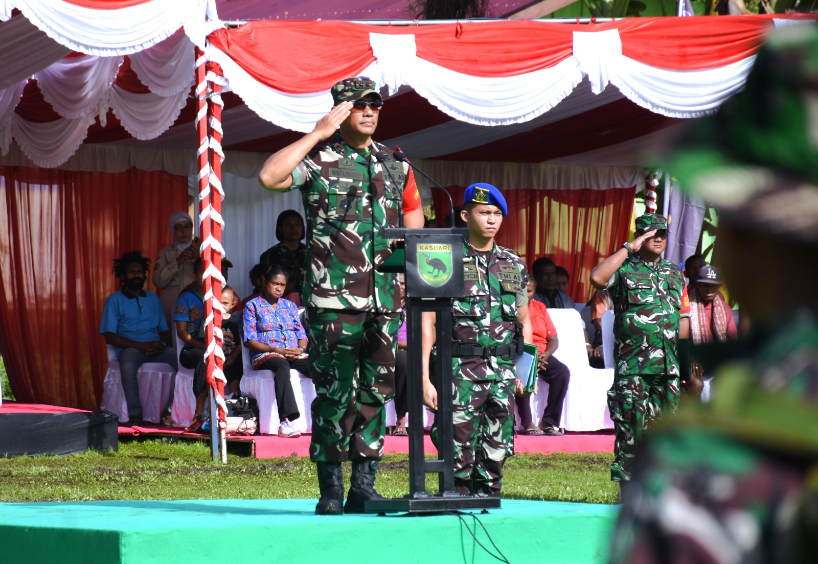 Sorong – Papua Barat Daya, Komandan Resor Militer (Danrem) 181/PVT Brigjen TNI Totok Sutriono, S.Sos., M.M., mendampingi Panglima Komando Daerah Militer (Pangdam) XVIII/Kasuari Mayjen TNI Jimmy Ramoz Manalu, S.Hub.Int., M.H.I., dalam upacara penutupan program TNI Manunggal Membangun Desa (TMMD) ke-124 Tahun 2025 yang dilangsungkan di Kampung Jeflio, Distrik Mayamuk, Kabupaten Sorong, Papua Barat Daya, Rabu (4/6//25).