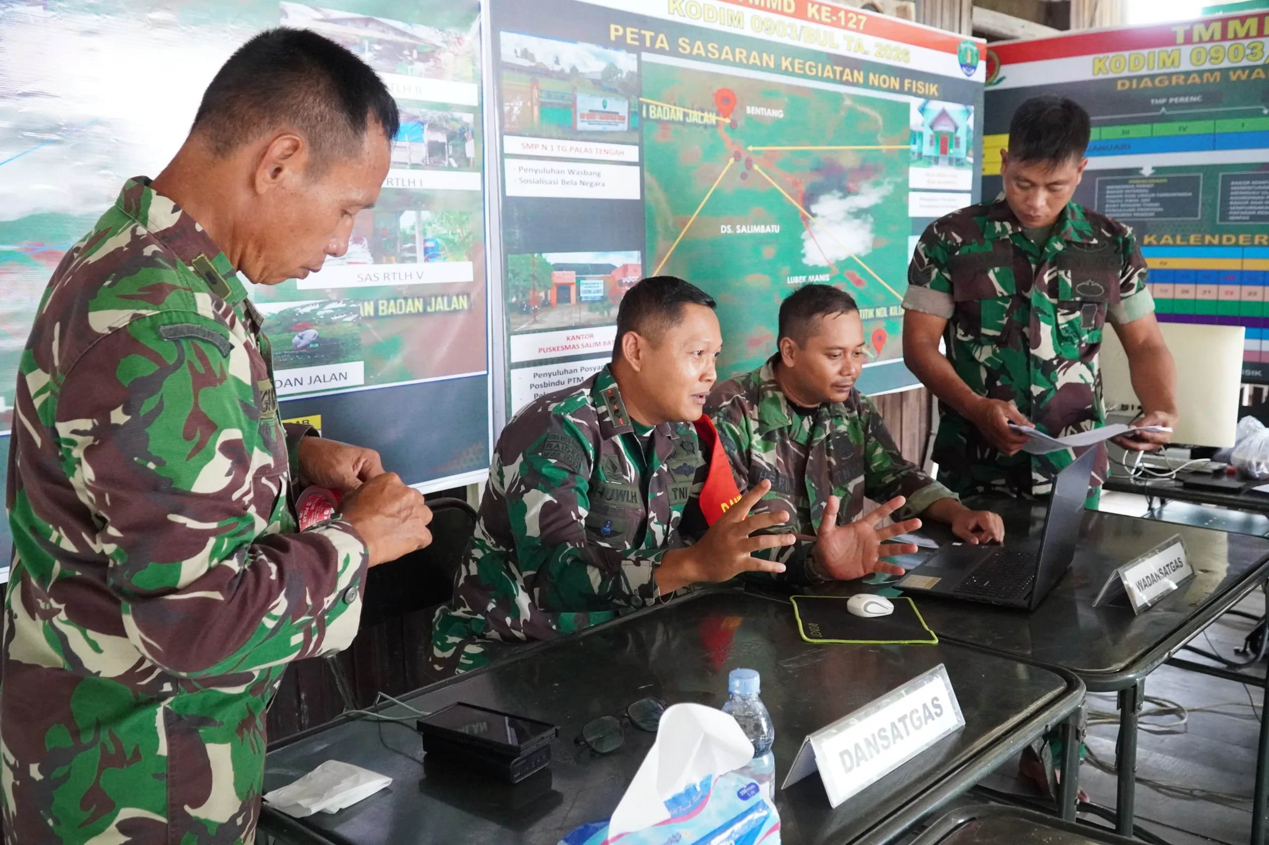 Kedatangan Dansatgas TMMD ke-127, Letkol Inf Dhuwi Hendradjaja, S.Sos., M.I.Pol., untuk mengetahui kesiapan petugas pos kotis yang sebagai sarana Informasi terkait pelaksanaan program TMMD.