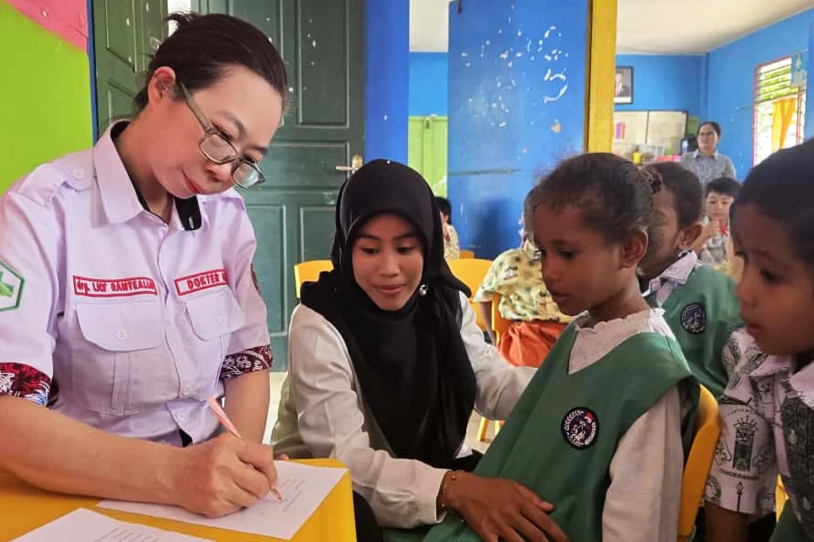 Selain penyuluhan, kegiatan ini juga diisi dengan pemeriksaan gigi gratis bagi seluruh murid TK Kartika VI-9. Pemeriksaan dilakukan langsung oleh Drg. Lili Raneallo bersama tim kesehatan dari Puskesmas Mopah Baru. Anak-anak tampak antusias dan berani mengikuti pemeriksaan gigi.