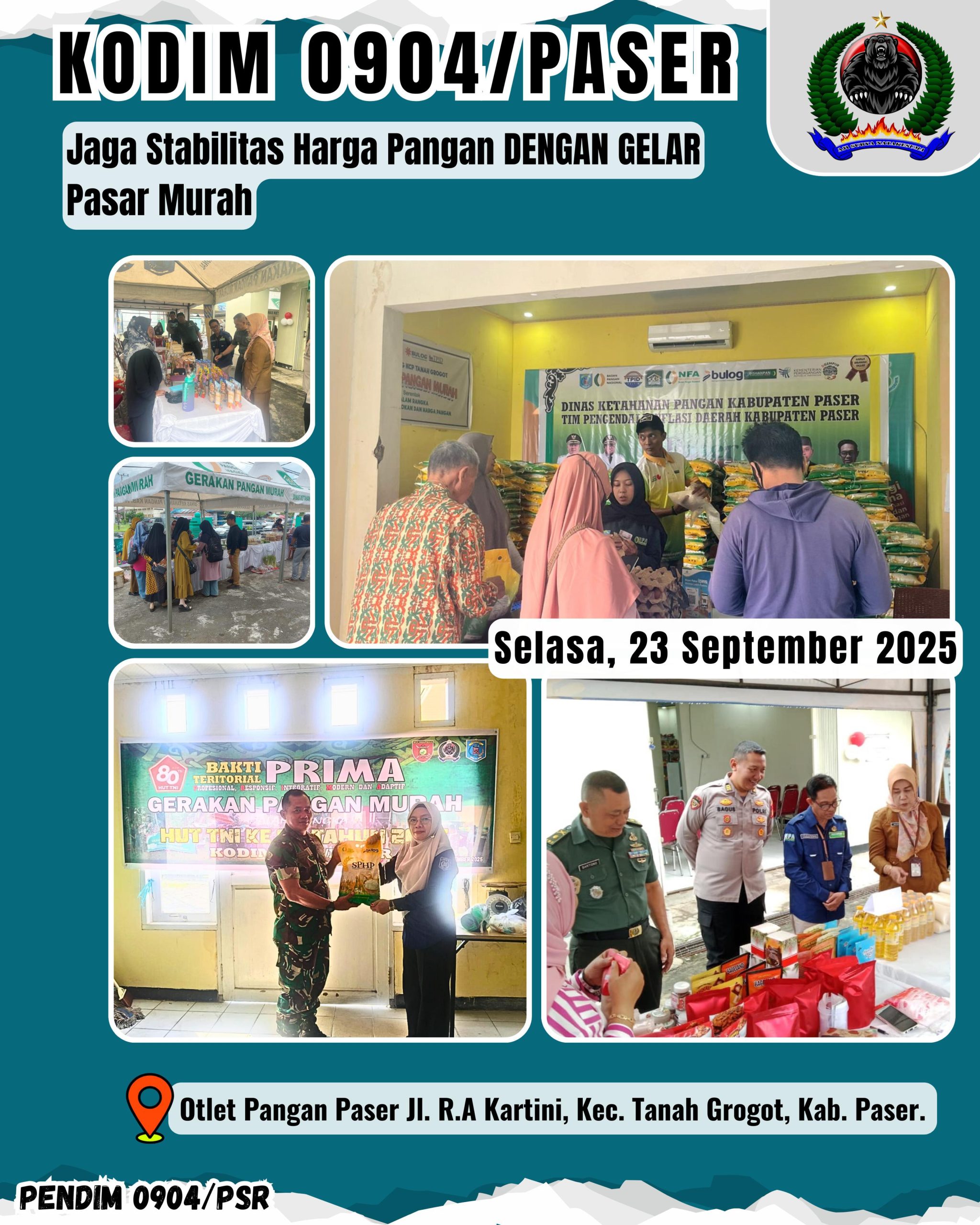 Kodim 0904/Psr, Korem 091/ASN, Kodam VI/Mlw – Sebagai upaya dalam memenuhi kebutuhan masyarakat akan sembako, Kodim 0904/Paser bekerja sama dengan Bulog dan Dinas Ketahanan Pangan menggelar Operasi Pasar Murah yang bertempat di Outlet Pangan Paser, Selasa (23/9/2025).