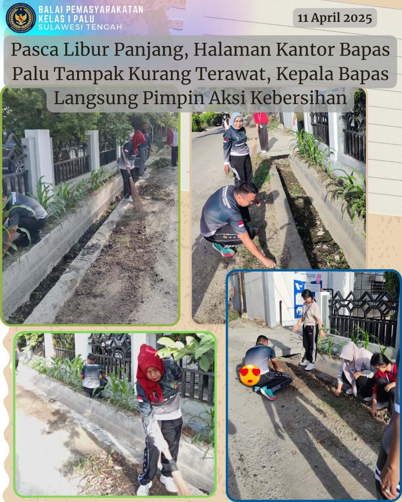 Palu, 11 April 2025 – Suasana pagi di halaman kantor Balai Pemasyarakatan (Bapas) Kelas I Palu terlihat sedikit berbeda dari biasanya. Pasca menjalani libur atau cuti bersama, tampak beberapa area di sekitar kantor terlihat kurang terawat dan sedikit kotor. Menanggapi hal tersebut, Kepala Bapas Kelas I Palu, Hasrudin, langsung mengambil inisiatif dengan memimpin seluruh pegawai untuk melaksanakan kegiatan bersih-bersih di lingkungan kantor pada Jumat pagi ini.