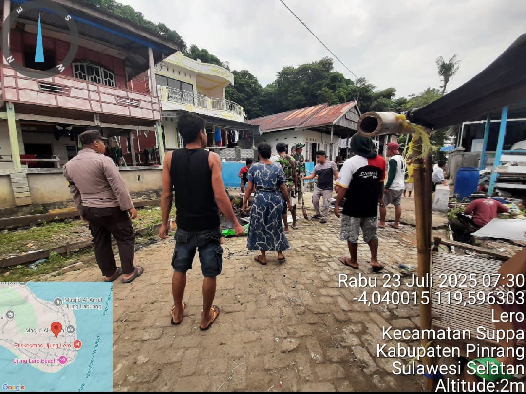 Pinrang_ Untk menjaga kebersihan Lingkungan, Koramil-01/Suppa Kodim 1404/Pinrang menggelar kerja bakti bersama warga dengan sasaran pembersihan pembersihan saluran air di Dusun Butung Desa Lero Kecamatan Suppa Kabupaten Pinrang, Kamis (24/07/2025).