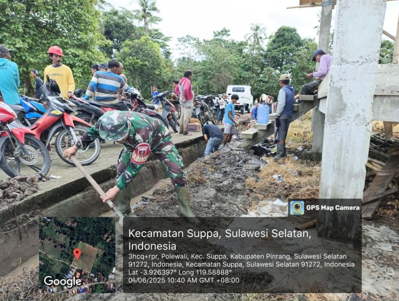 Danramil-01/Suppa Lettu Inf Jamaluddin yang memimpin langsung kerja bakti tersebut mengatakan bahwa kerja bakti dilakukan sebagai bagian dari kegiatan kebersihan lingkungan dan pencegahan banjir dengan melibatkan Babinsa dan warga setempat secara gotong-royong.