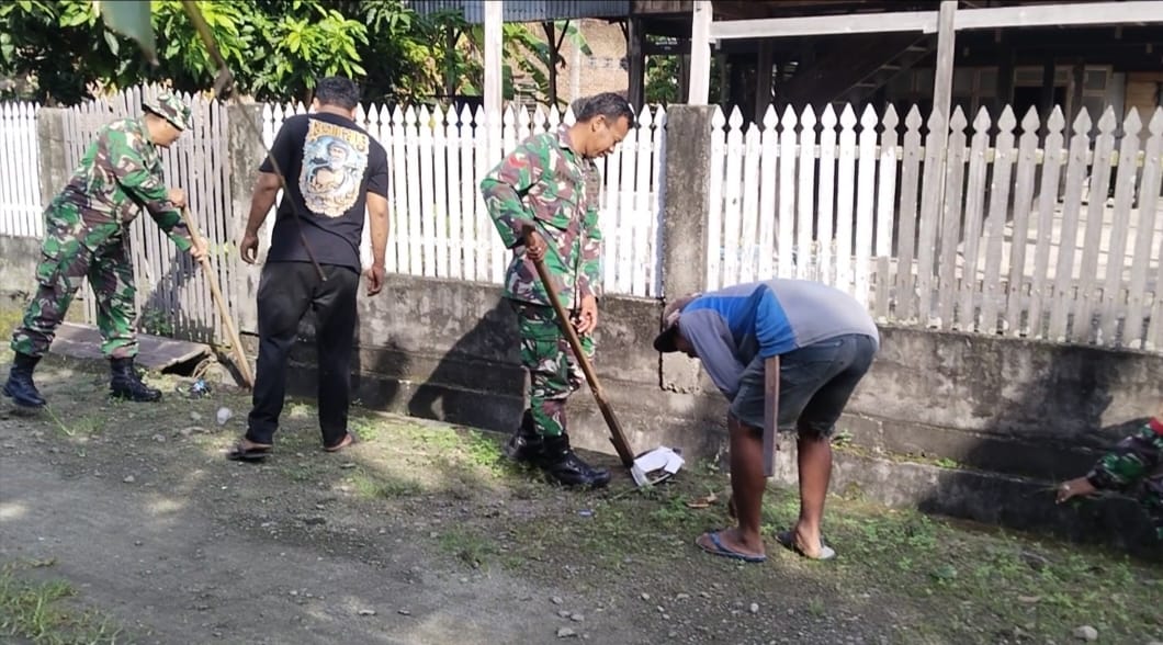 Anggota Koramil-08/Lanrisang bekerjasama dengan warga masyarakat membersihkan saluran air ditepi jalan yang mengalami pendangkalan karena sampah dan tanah, serta ditumbuhi rumput liar.