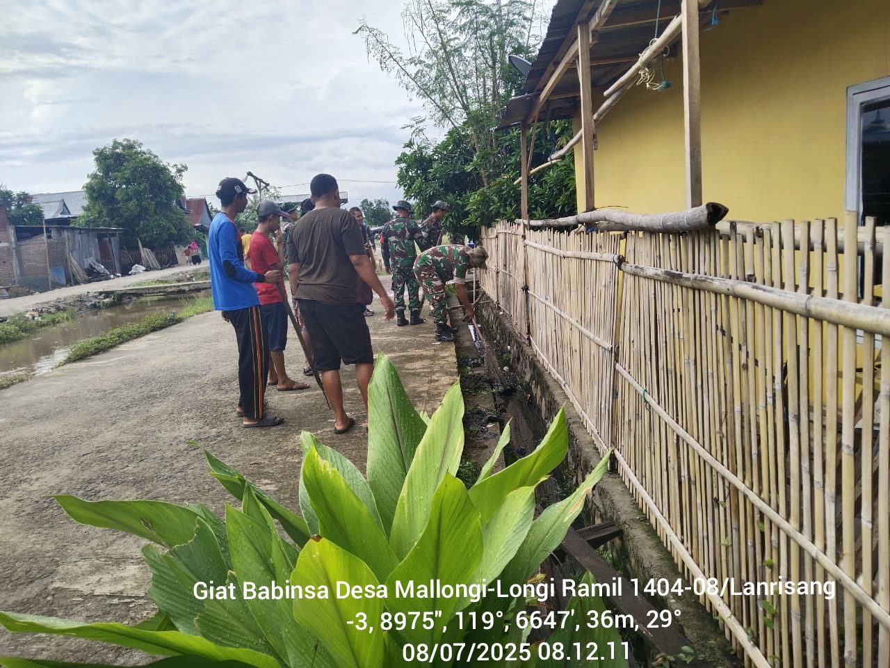 Pinrang_ Anggota Koramil-08/Lanrisang Kodim 1404/Pinrang bersama warga melaksanakan kerja bakti pembersihan saluran air di Dusun Kanari Desa Mallongi-longi Kecamatan Lanrisang Kabupaten Pinrang, Selasa (08/07/2025).