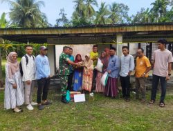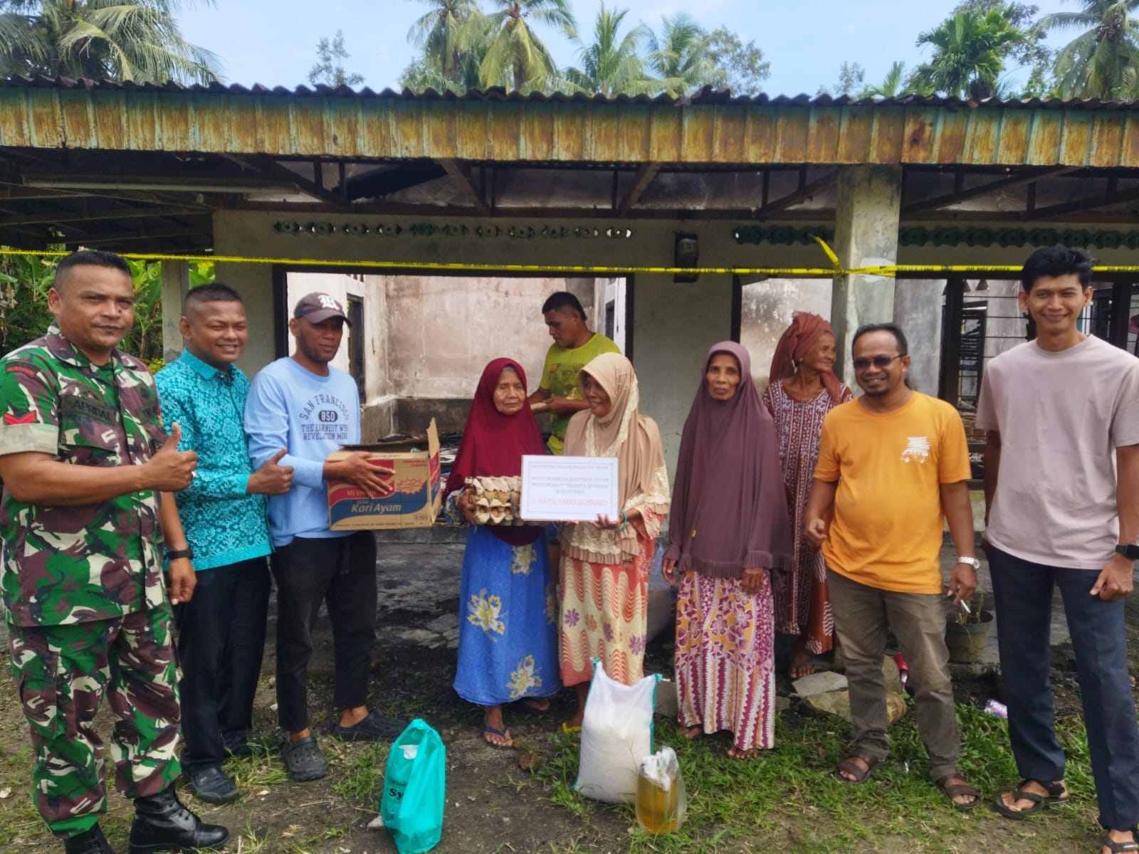SUNGAI SARIAK,- Babinsa Koramil 03/Sungai Sariak Kodim 0308/Pariaman Koptu Aprisal bersama Walinagari Afrizal beserta Bamus dan Perangkat Nagari Balah Aie Utara menyerahkan bantuan sosial sembako bagi korban kebakaran. Bantuan sosial sembako sumbangan ini berupa beras 20 kilogram, minyak goreng 2 liter, mi instan 1 karton dan gula pasir 1 kilogram, telor 60 butir,Sarden,teh dan Susu.