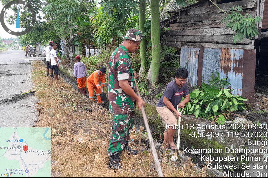 Pinrang_ Sebagai bentuk kepedulian terhadap kebersihan Lingkungan, Babinsa Koramil-06/Duampanua Kodim 1404/Pinrang Serka Hamsir mengajak warga melaksanakan kerja bakti membersihkan saluran air di Dusun Susbater Desa Bungi Kecamatan Duampanua Kabupaten Pinrang, Rabu (13/08/2025).