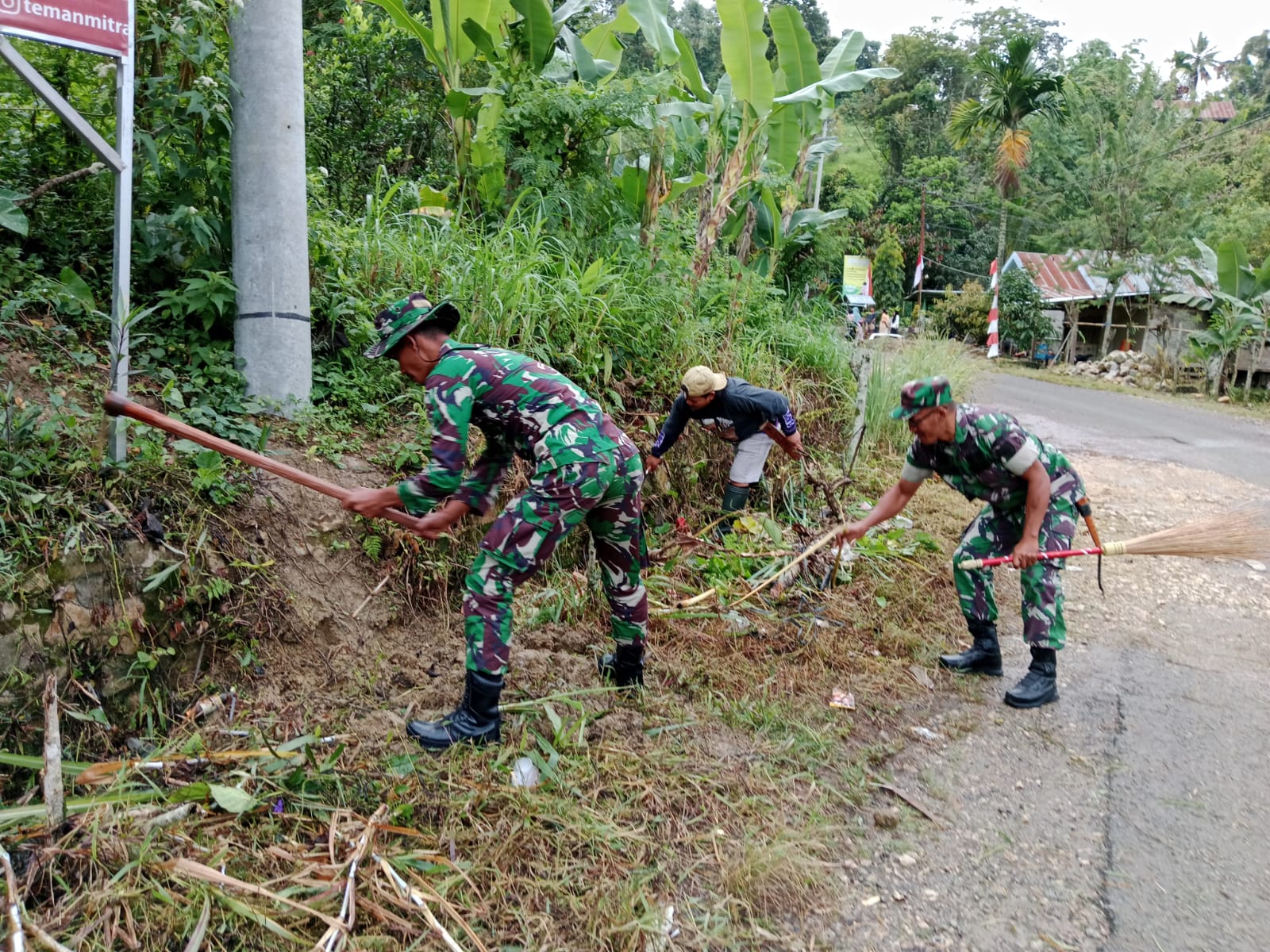 Pada kesempatan tersebut Pelda Yudin Djoni melaksanakan gotong-royong bersama masyarakat membersihkan sampah dan rumput liar di pinggir badan jalan di wilayah binaan tersebut, kondisi tersebut mendorong Babinsa mengajak masyarakat untuk bergotong royong guna melaksanakan pembersihan rumput dan sampah sehingga nantinya membuat kondisi jalan menjadi kelihatan bersih dan terpelihara.