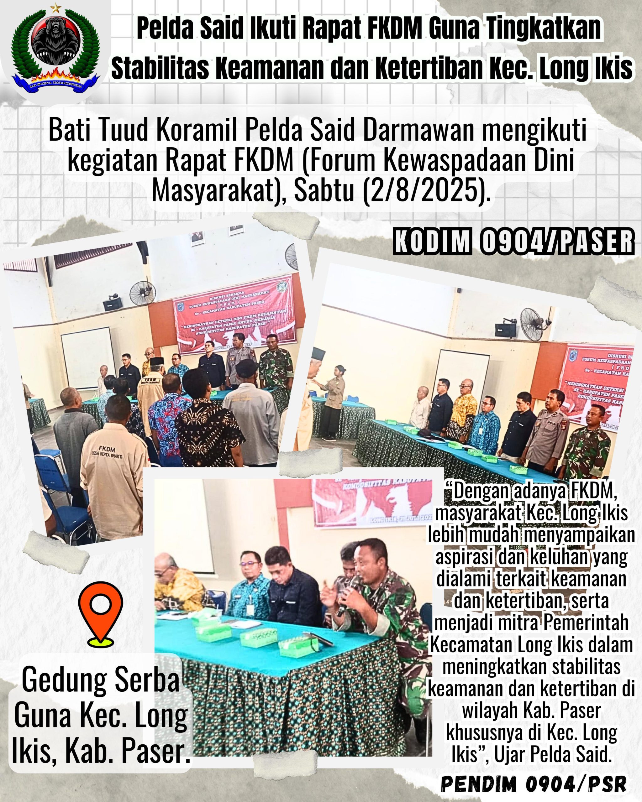 Kodim 0904/Psr, Korem 091/ASN, Kodam VI/Mlw – Danramil 0904-04/Long Ikis diwakili oleh Bati Tuud Koramil Pelda Said Darmawan telah mengikuti kegiatan Rapat FKDM (Forum Kewaspadaan Dini Masyarakat) yang bertempat di Gedung Serba Guna Kec. Long Ikis, Kab. Paser, Sabtu (2/8/2025).